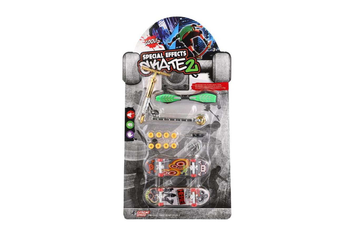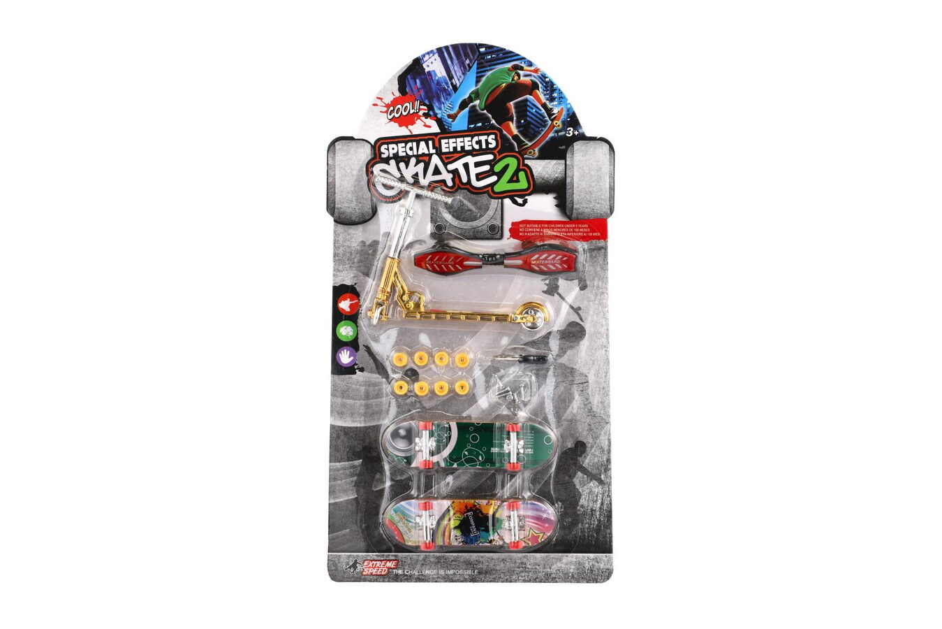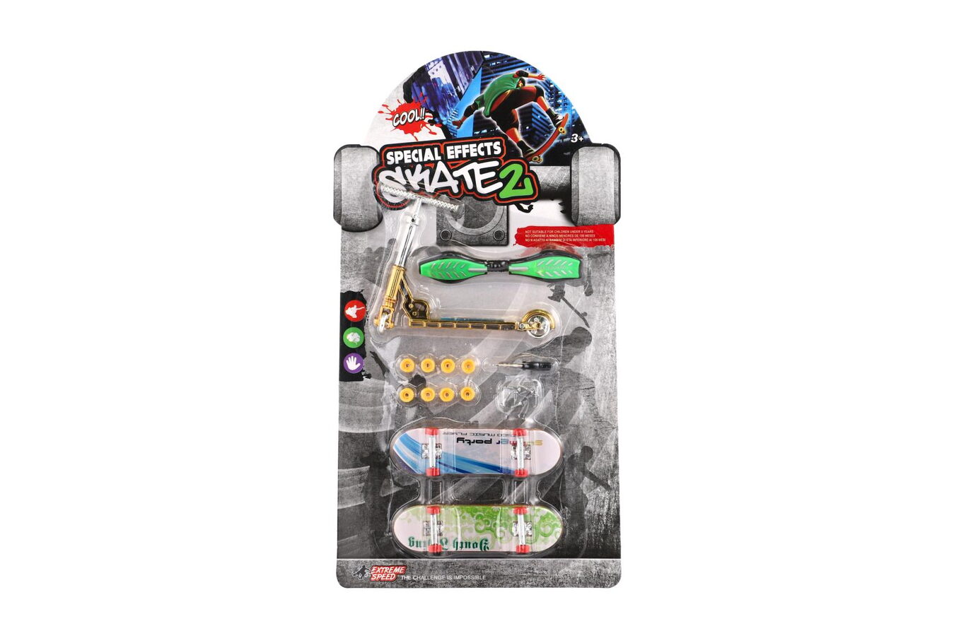 Sada skateboard šroubovací, koloběžka prstová, waveboard plast s doplňky mix druhů na kartě 16x30cm