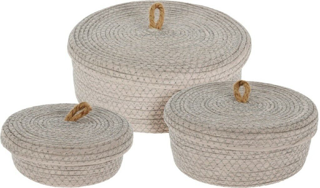 - sada 3 různě velkých úložných košíků ve světlém provedení- víko s úchytem- přírodní materiál, který je lehký, ale přitom odolný, nepraská a má dlouhou životnost- košíky lze využít jako multifunkční úložný prostor pro skladování kosmetiky, hraček, doplňků, šperků, potravin, atd..- sada obsahuje 3 košíky v různých velikostech:- malý: 16 x 6,5 cm- střední: 21 x 8,5 cm- velký: 26 x 10 cm- barva košíku: světle šedá- značka: Homestyling