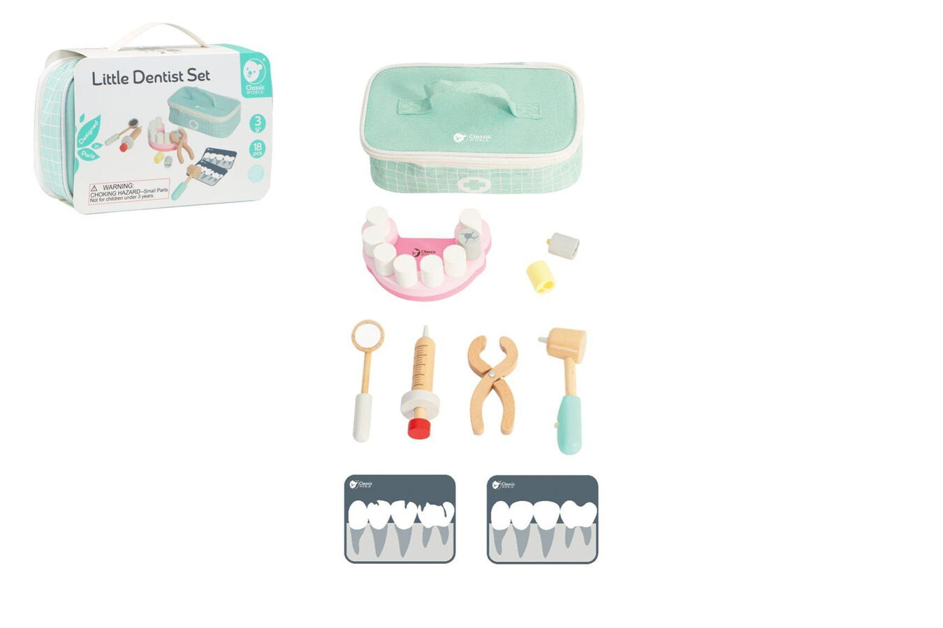 Hra na zubaře není jen jednou z her na role, ale také učením péče o hygienu a následků jejího nedostatku. Tento výrobek obsahuje 4 zubařské nástroje, 2 rentgenové karty, 8 zubů v držáku a 2 zuby navíc a tašku na uložení veškerého příslušenství. Budoucí lékaři mohou svým pacientům dávat injekce, extrahovat a kontrolovat stav jejich zubů.