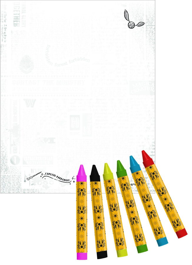 Set obsahuje téměř 500 různých druhů samolepek, blok (32 listů) ke psaní i malování a 12 voskovek. Tento velký samolepkový set obsahuje více než 500 samolepek s motivy oblíbených postav a scén z kouzelnického světa. Součástí balení je také blok s obálkou Harry Potter a sada 12 voskovek, se kterými si děti mohou vytvářet vlastní magické obrázky.