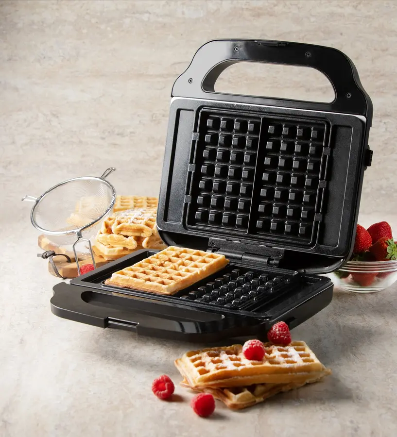 Obsahuje tři vyměnitelné sady desek pro XL toastové sendviče (o 50 % větší než standardní velikost), vafle belgického typu (4x7) a grilovaná jídla.