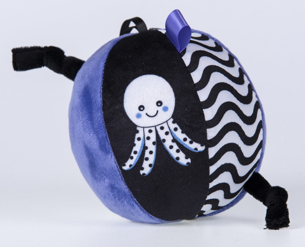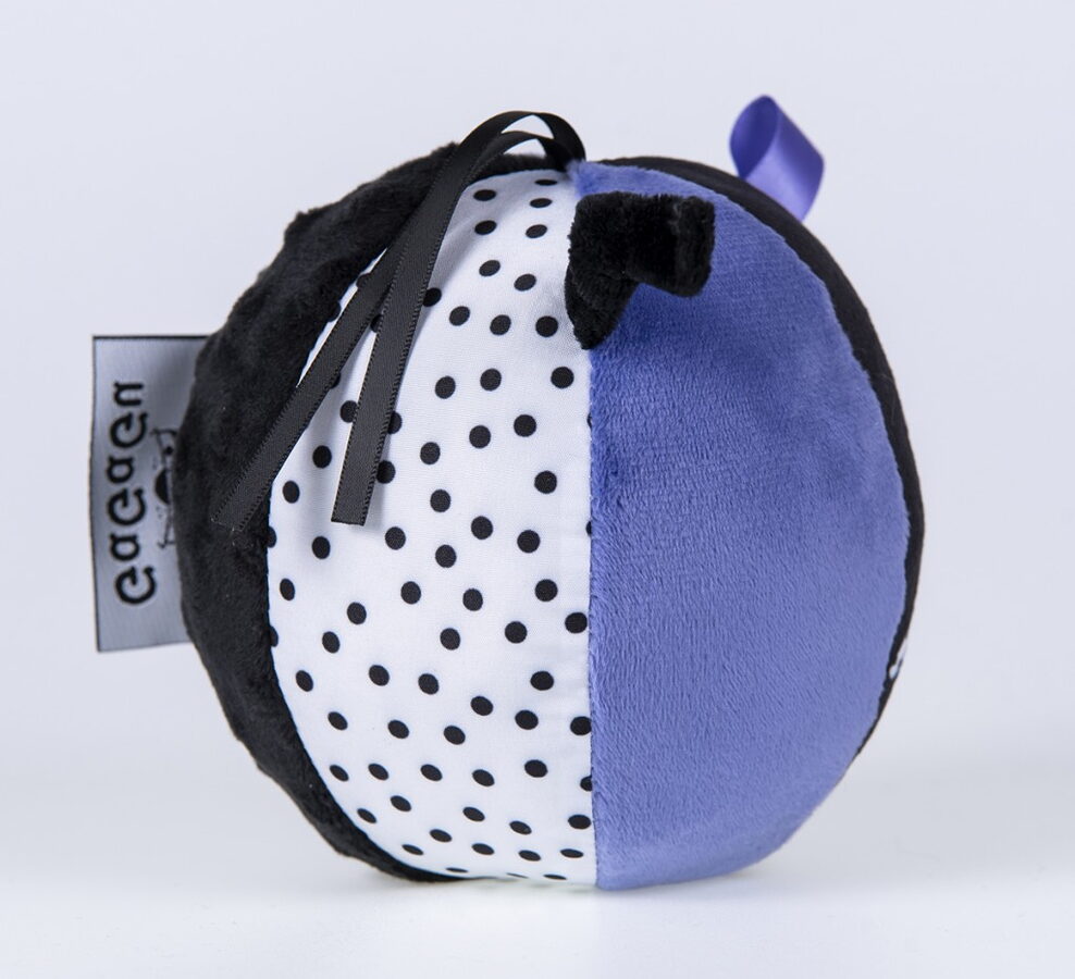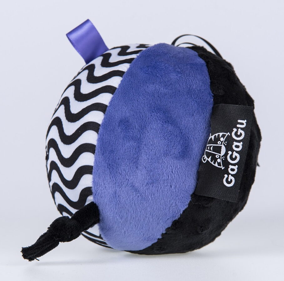 Senzační plyšový míč GaGaGu se zvonkem je hračka, která kombinuje vzdělávání a zábavu. Díky kontrastním barvám a rozmanitým vzorům stimuluje zrak dítěte, přitahuje jeho pozornost a podporuje rozvoj vizuálního vnímání. Na jednom z povrchů míče je roztomilý motiv chobotničky, který dále podporuje hru. Měkký a příjemný povrch míče je ideální pro chytání malými ručičkami a další prvky, jako jsou stužky a uzlíky, podporují rozvoj jemné motoriky (pohyby rukou a prstů). Měkká rolnička uvnitř míče vydává při každém pohybu příjemný zvuk, který stimuluje sluch dítěte a vybízí starší děti k lezení za míčem. Plyšový senzorický míč GaGaGu je vyroben z vysoce kvalitních materiálů, které zajišťují odolnost a bezpečnost během hry. Díky delším stuhám v horní části míče jej lze snadno připevnit na kočárek nebo autosedačku. Výrobek je určen pro děti 0+, takže je skvělou volbou jako dárek pro nejmenší děti.