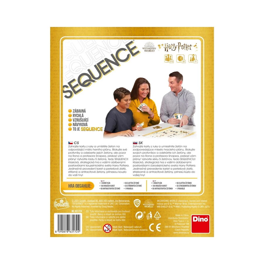 Jak doma vykouzlit pohodu? Přivolejte na pomoc Harryho Pottera. S partou známého čaroděje si zahrajete zábavnou hru Sequence. Cílem karetní partie je vytvořit požadovaný počet sekvencí, neboli řad po 5 žetonech od stejné barvy. Vítězí ten, komu se to podaří jako prvnímu. Sekvence mohou být poskládány horizontálně, vertikálně nebo úhlopříčně. Se skládáním sekvencí vám může pomoci profesor Snape nebo zrzek Ron Weasley, nemilé překvapení vám naopak přichystá karta s Nymfadorou Tonksovou nebo profesorkou Trelawneyovou.