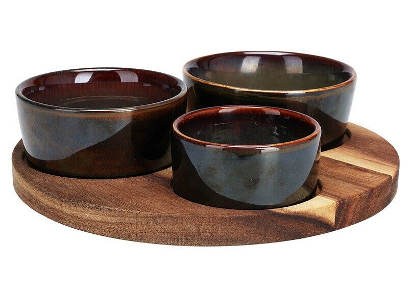 - servírovací set misek pro nejrůznější příležitosti- materiál: kamenina s lesklou glazurou- všechny misky jsou uloženy na stylovém podnosu z akátového dřeva- perfektní pro servírování předkrmů, pochutin, dipů a omáček- žáruvzdorné do 200 °C, misky lze využít také k zapékání- misky jsou vhodné do myčky nádobí- sada obsahuje 3 kusy různě velkých misek a 1 kulatý podnos- rozměry misek: 10 x 4 cm / 9 x 3,5 cm / 7 x 3,4 cm- rozměry podnosu: 20 x 1,2 cm- barva: hnědá
