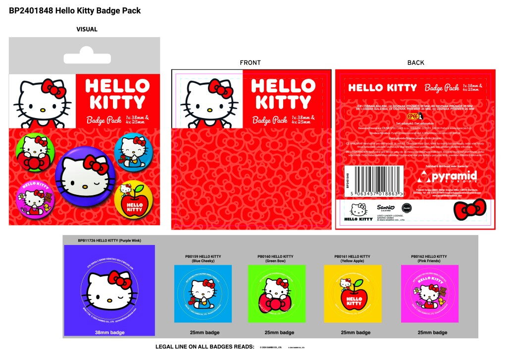 Sada odznaků s motivem Hello Kitty, 5 ks v balení. Rozměry 1× průměr 38 mm, 4× průměr 25 mm.