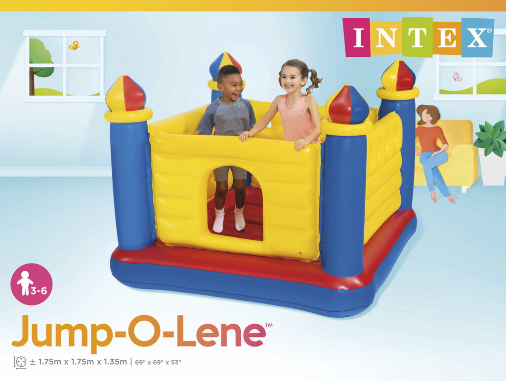Skákací hrad pro pohybovou aktivitu dětí. Nafukovací podlaha a vysoké stěny pro bezpečné hraní. Velikost 175×175×135cm.