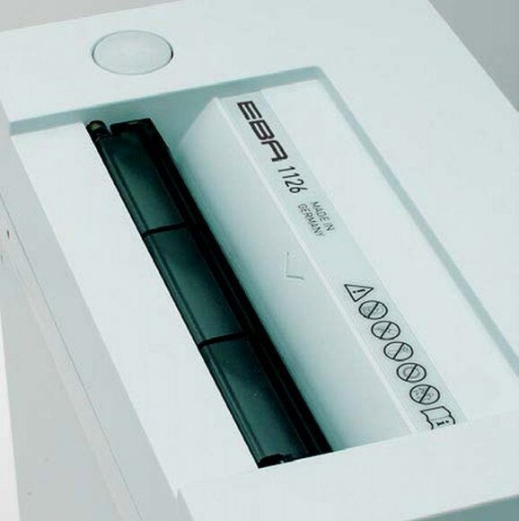 EBA 1126 S4 vlastní skartovací válce z tvrzené oceli, odolné proti kancelářským svorkám a sponkám ze sešívačky. Po stranách skartovací hlavy a koše jsou průlisy pro snadné uchopení skartovací hlavy a následné vyprázdnění koše. Objem koše je 20L.