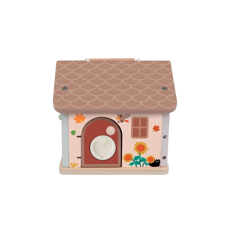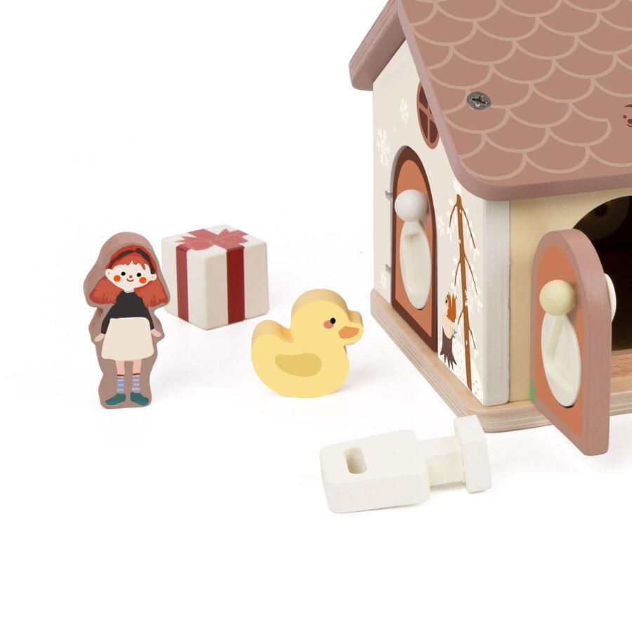 Objevuj svět uvnitř malebného dřevěného domečku! Tato krásná vkládačka nabízí dětem 11 dílků k prozkoumání a vkládání – postavičky, zvířátka i drobnosti z domácnosti. Děti si rozvíjejí jemnou motoriku, učí se koordinaci ruky a oka a trénují trpělivost při vkládání jednotlivých prvků na správné místo. Díky praktickému držadlu na střeše si domeček mohou snadno přenášet. Jemné barvy a ilustrace podněcují fantazii a radost z hry.