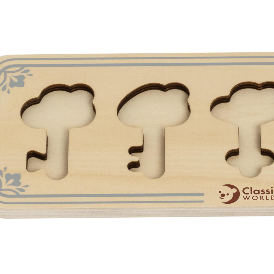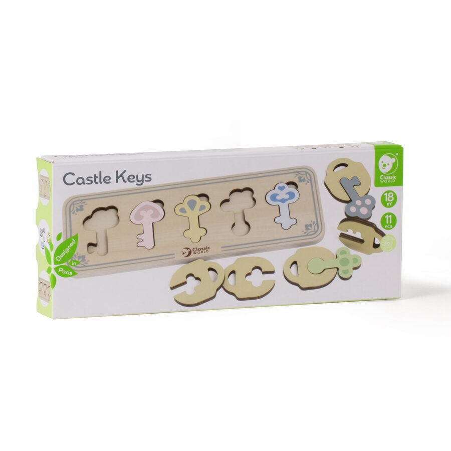 Dřevěné puzzle pro děti skládající se z dřevěného rámečku s výřezy ve tvaru klíčů, dřevěných klíčů a dřevěných zámků je vkládacím puzzle, které potrénuje motorické dovednosti, koordinaci očí a rukou, zrakové vnímání a potrápí dětskou mysl. Součastí balení je 11 kusů.¨