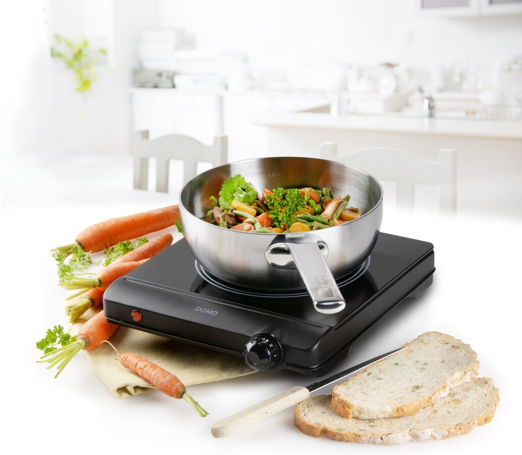 Jednoplotýnkový sklokeramický vařič DOMO DO30111KP s kompaktními rozměry se stane výtečním pomocníkem na chatách, chalupách a v menších bytech. Ohřev na sklokeramické desce je pokročilá technologie ohřevu, která ušetří drahocený čas i peníze (až 30% oproti bežným litinovým vařičům). Sklokeramické plotýnky s infračerveným topným tělesem se velmi rychle a efektivně nahřívají. Manuální termostat nastavitelný v 6 stupních, pokryje všechny potřeby i náročnějšího kulináře. Světelná kontrolka upozorňuje na zapnutý přístroj.