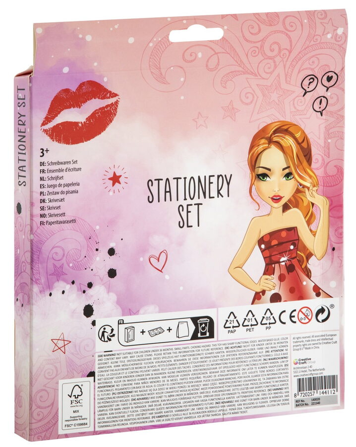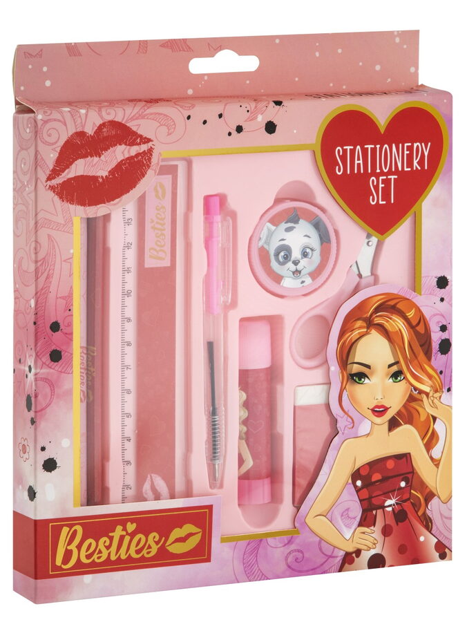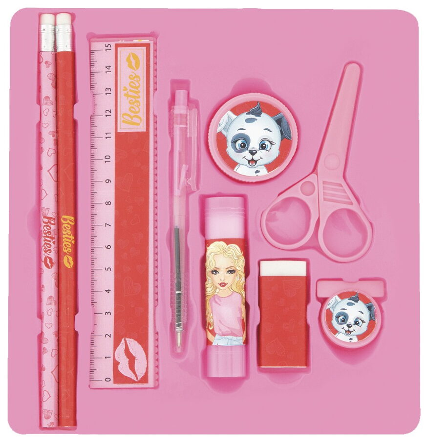 Školní sada Besties – obsahuje ořezávátko, 2 obyčejné tužky, pravítko, propisovačku, gumu a lepidlo.