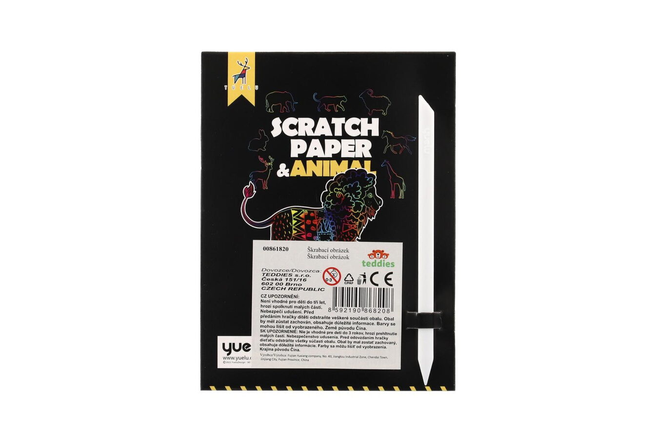 Škrabací obrázek, kde perem šeškrábete dle vlastní fantazie zvíře. Doškrabejte mu např. srst, obličej atp. Dítě nakonec získá obrázek, kterým si může vyzdobit pokojíček, přičemž samo získá mnoho potřebných dovedností, jako je pozornost, trpělivost, opatrnost a přispěje k rozvoji tvořivého talentu a motoriky. Sada obsahuje 8 obrázků zvířat.