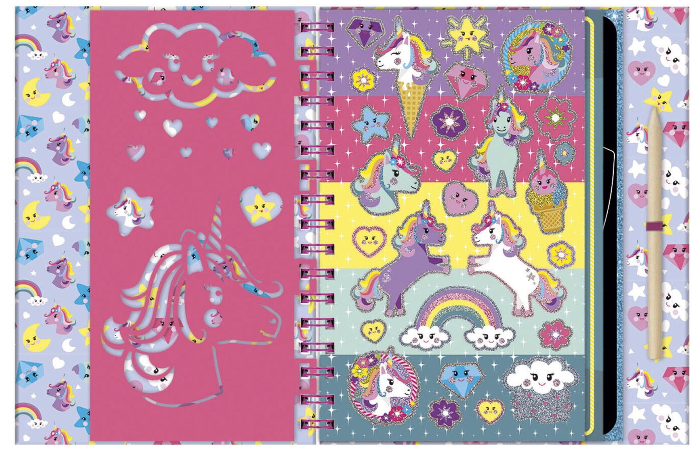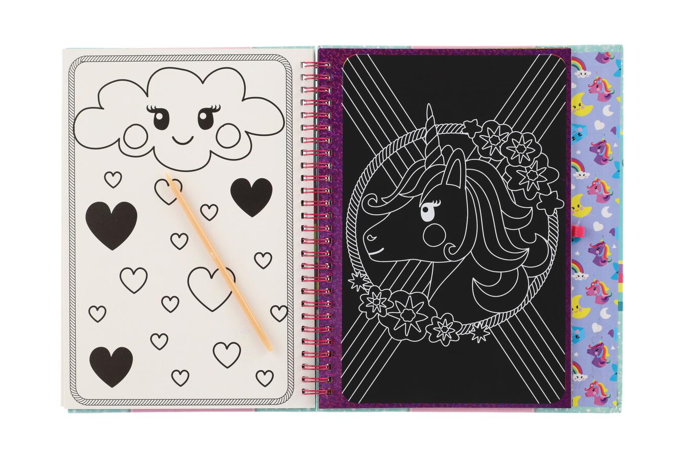 Škrabací obrázky v tvrdých deskách a ve spirálovém vázání k pohodlnému otáčení s motivy Jednorožce. Skvělé na cestování, ať už letadlem, vlakem nebo autem! Stačí seškrábat a objeví se barevný obrázek. Obsahuje:10 škrabacích obrázků, tužku se špičkou na vyškrabávání, šablony na obkreslení a samolepky.