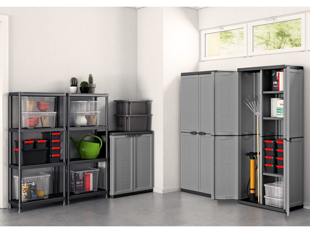 Skříň Keter Jolly Low je skvělým řešením tam, kde je potřeba uložit menší nářadí, úklidové prostředky nebo další vybavení bez nutnosti vysoké skříně. Plastová konstrukce je lehká, přesto dostatečně pevná a stabilní. Díky možnosti uzamčení a nastavitelné polici si snadno přizpůsobíte uspořádání podle svých potřeb. Využijete ji v domácnosti, technické místnosti i v kanceláři.