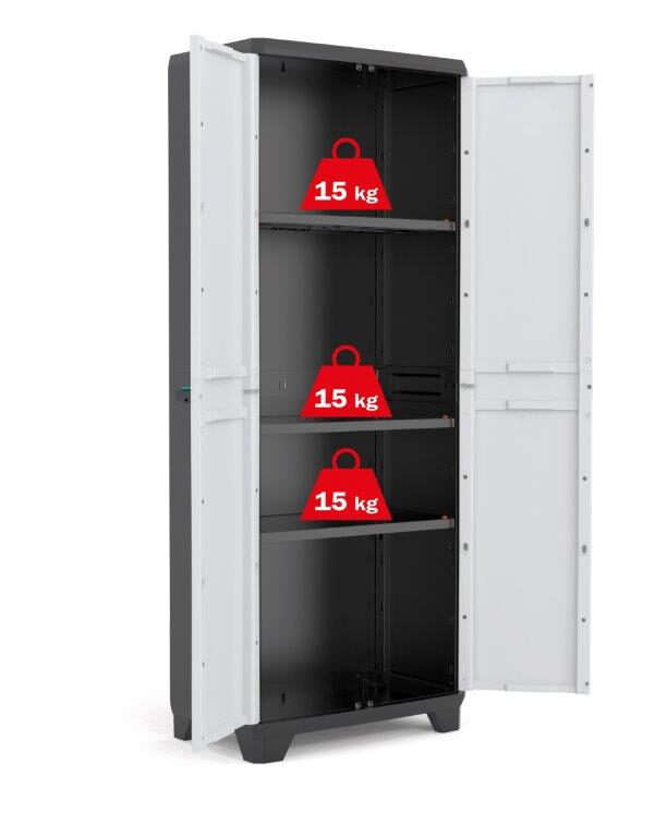 Skříň je vyrobena z kvalitního plastu, který je pevný, lehký a odolný. Díky třem výškově nastavitelným policím si interiér snadno přizpůsobíte podle velikosti ukládaných předmětů. Modré ergonomické úchyty umístěné na středu dveří zajišťují pohodlné otevírání i při plném zatížení.