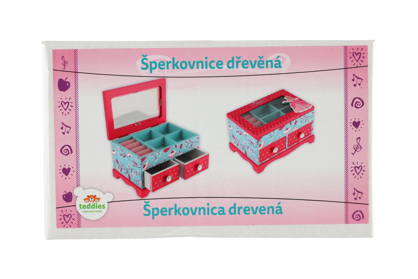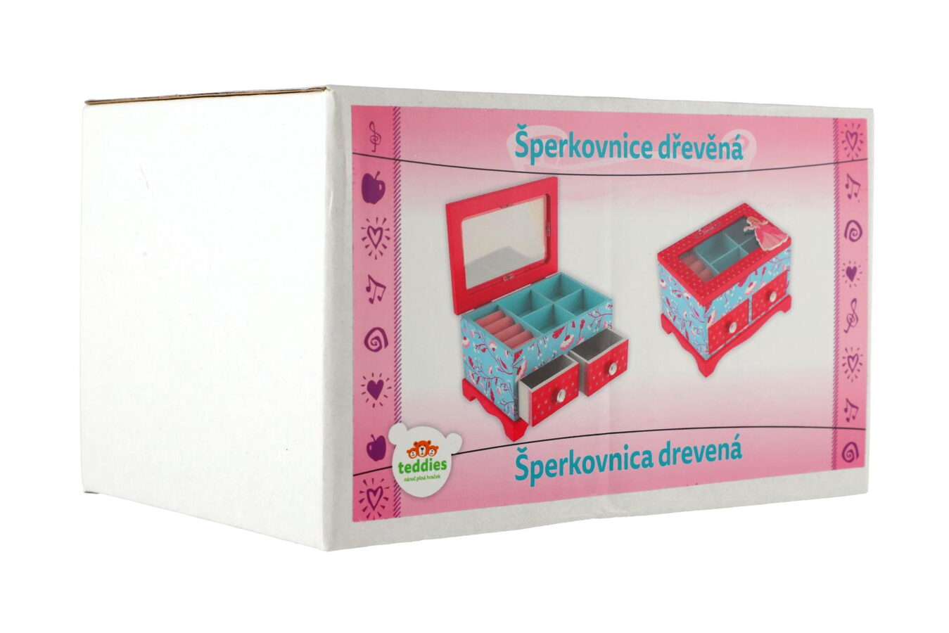 Skříňka šperkovnice Princess 2 zásuvky odklápěcí vrch dřevo 18x12,5x12cm v krabici
