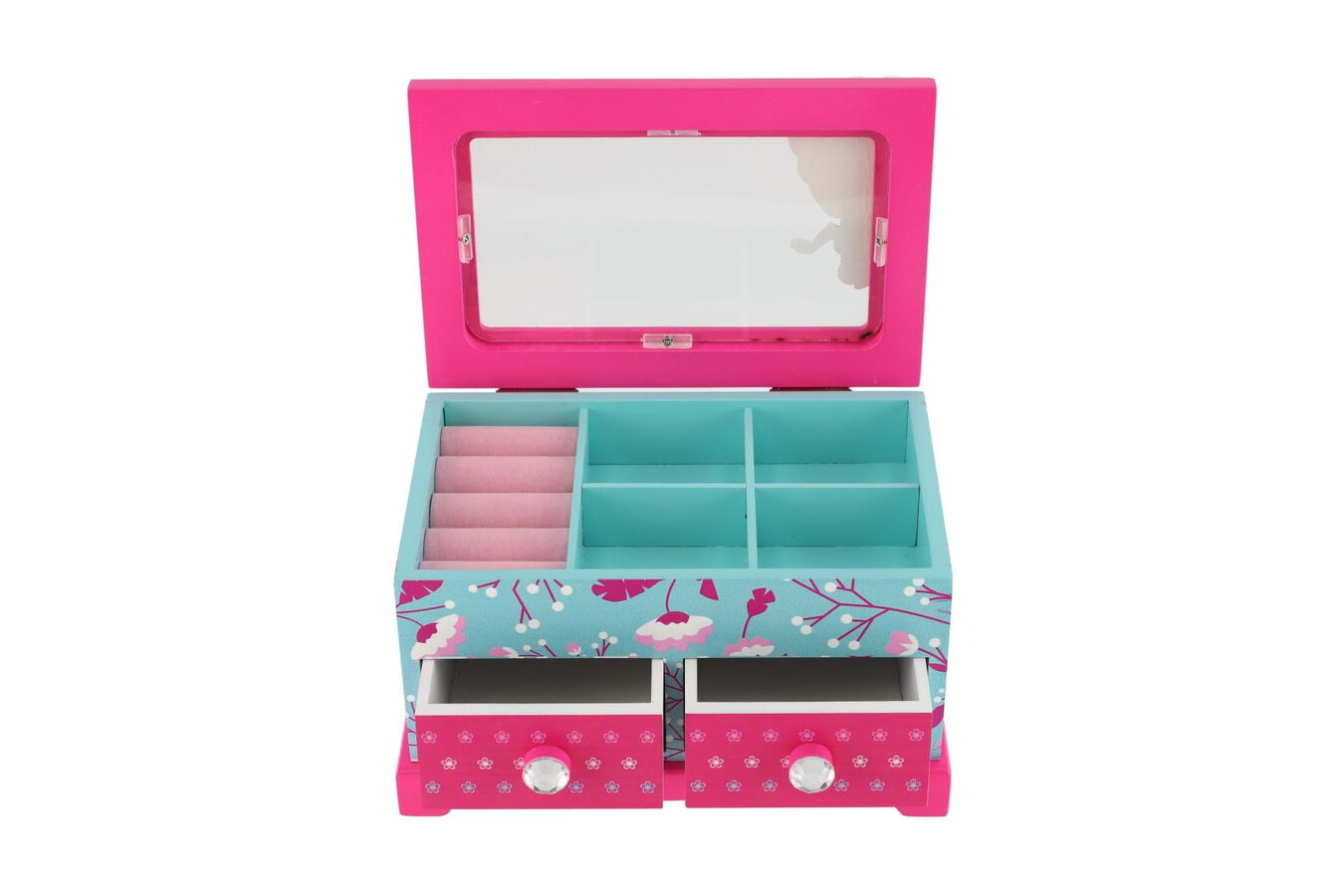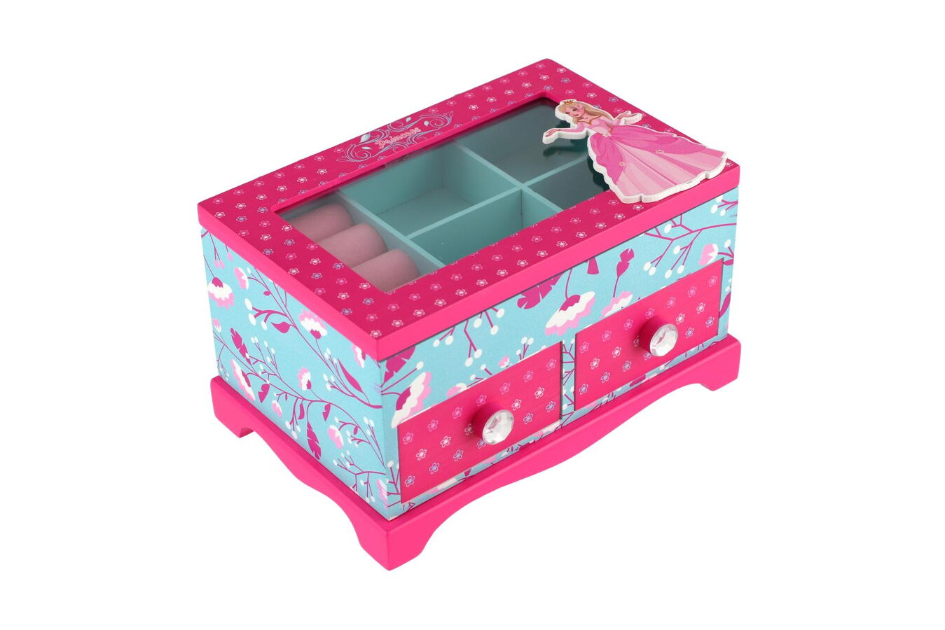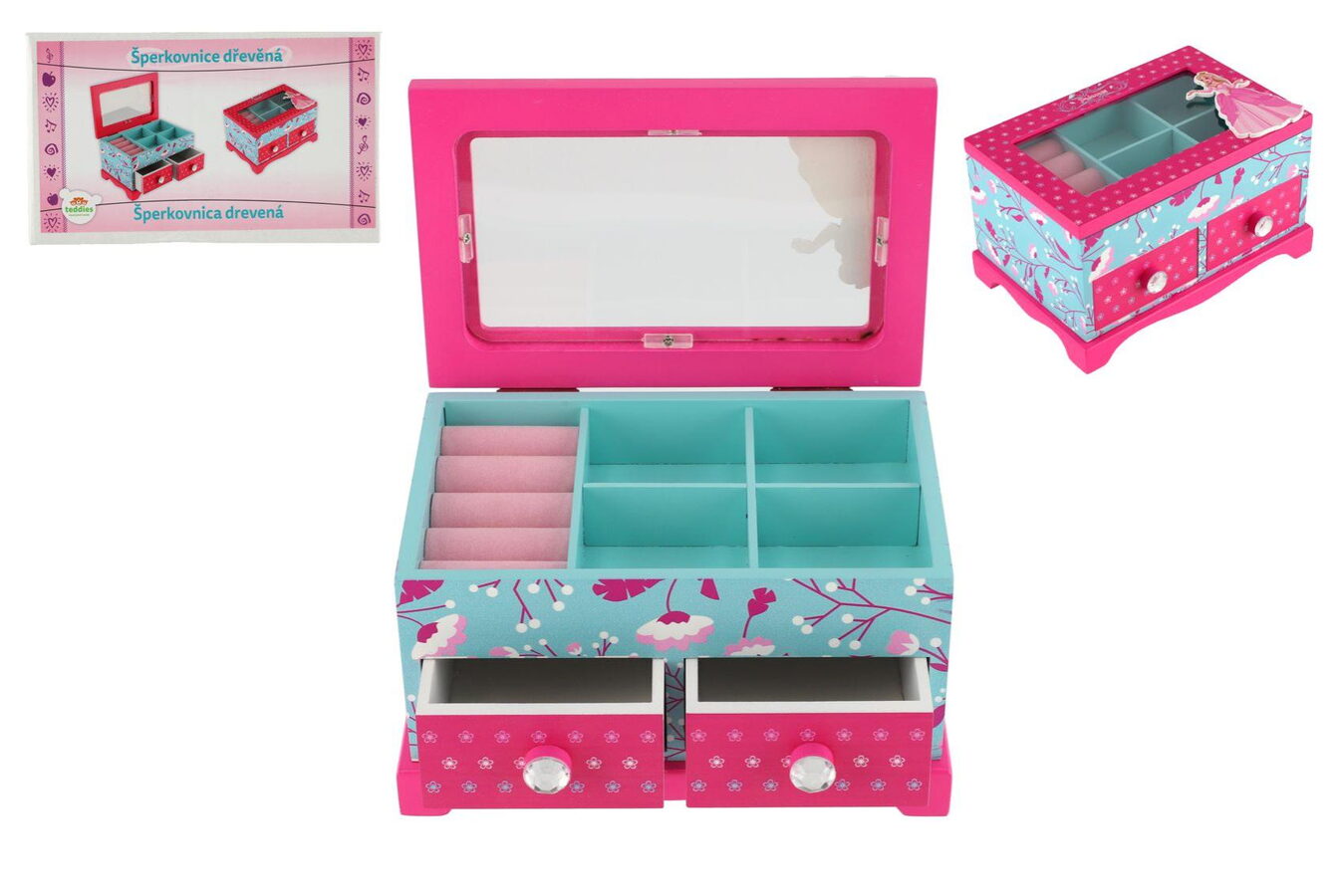 Šperkovnice bude ideálním místem pro uložení pokladů každé dívky. Je vyrobena ze dřeva a má skleněné víko. Šperkovnice má modrou barvu a je pomalována krásným motivem kytiček. Odklípěcí víko je růžové, má na sobě kytičky a princeznu. Tato barevná kombinace bude ideální doplněk pro dětský pokoj. Uvnitř je prostor pro pořádání suvenýrů nebo šperků. Šperkovnice má dvě zásuvky.
