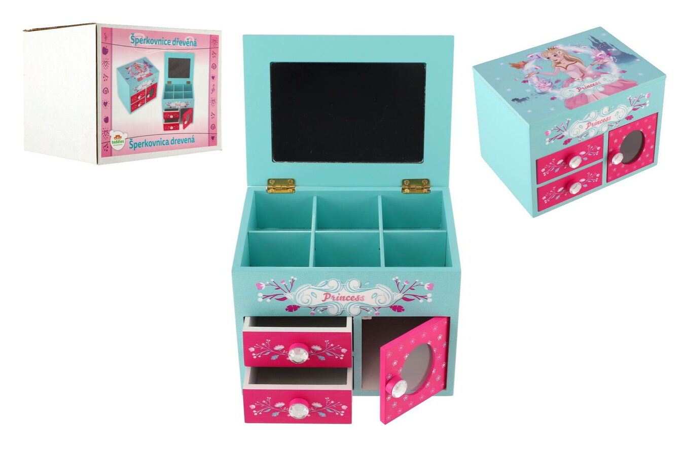 Skříňka šperkovnice Princess 3 zásuvky odklápěcí vrch se zrcátkem dřevo 16x12,5x12cm v krabici
