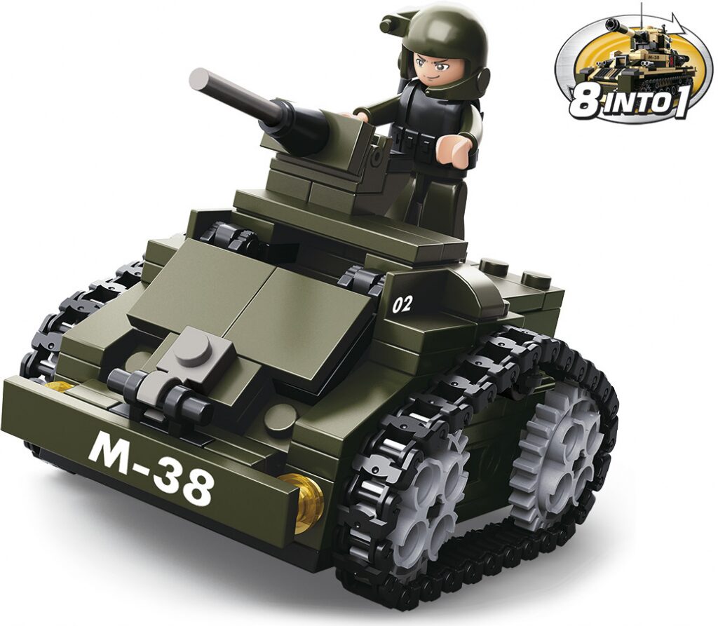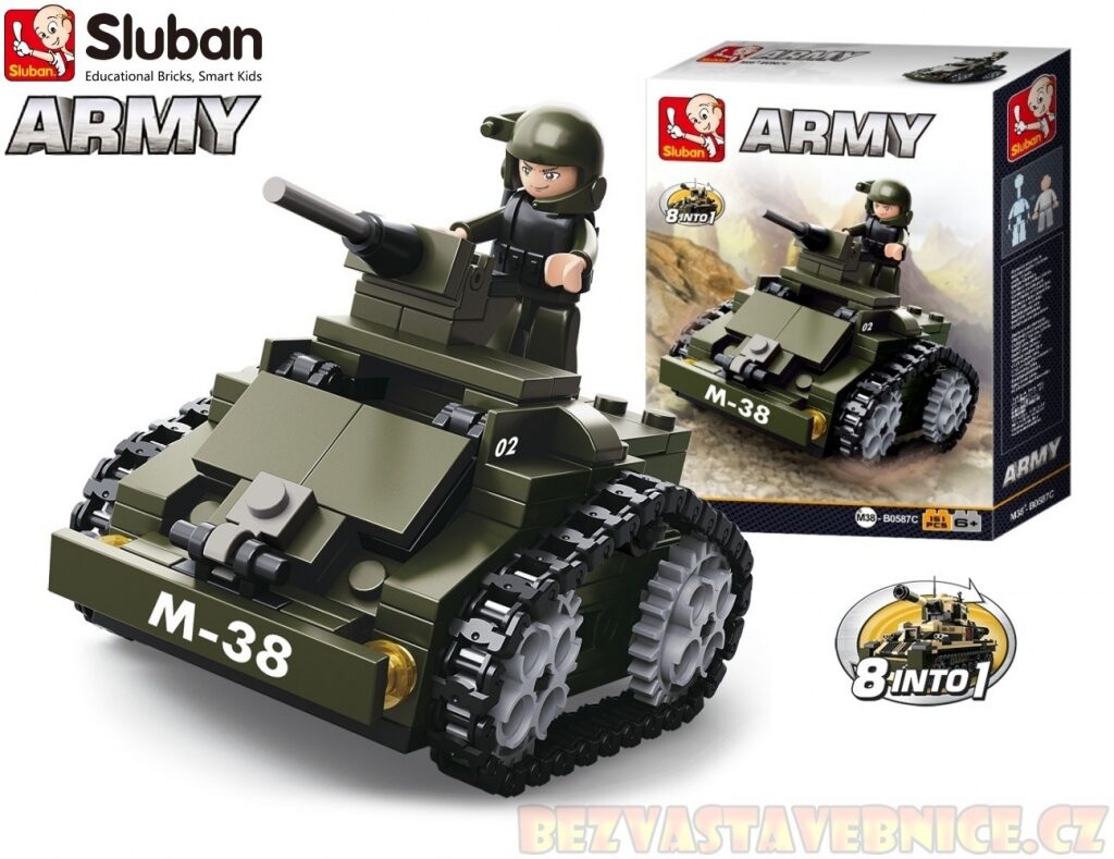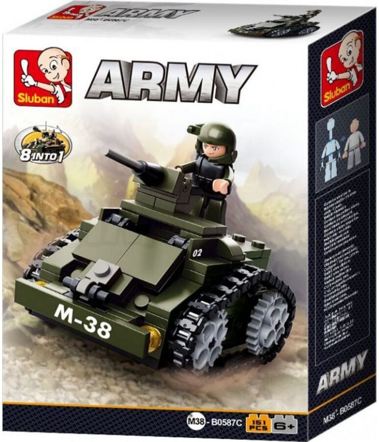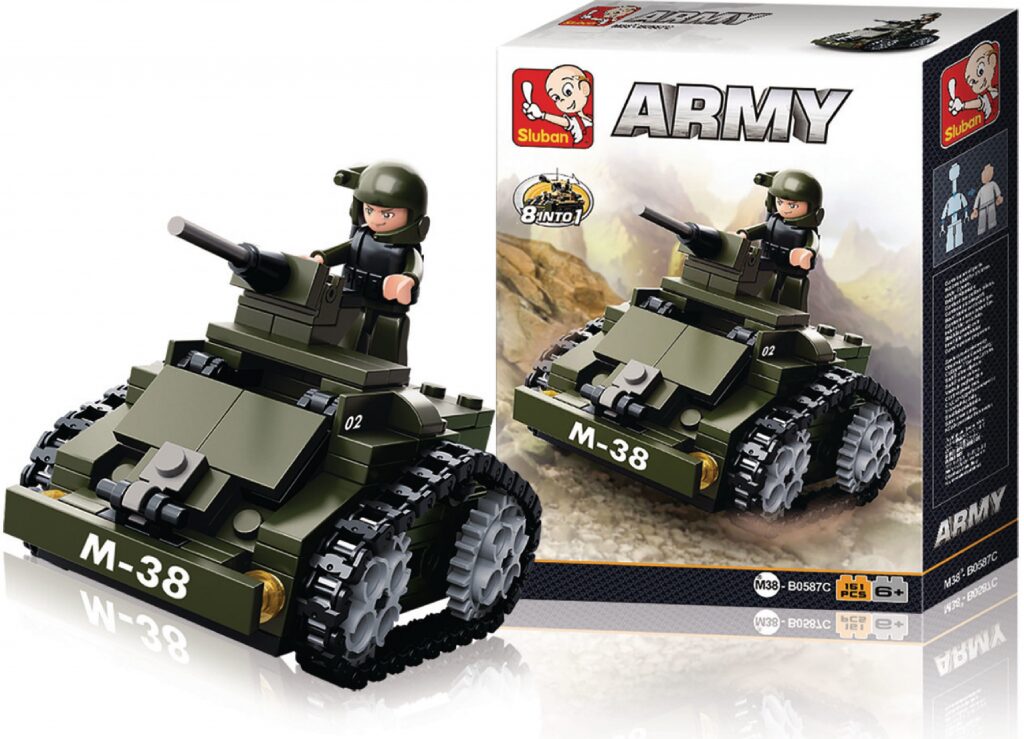 Ministavebnice vojenské techniky ze série Army 8into1, jejíž kompletací vznikne možnost sestavit velký ucelený model tanku, či obrněného vozidla. Inovativní stavebnice Sluban je možno kombinovat s podobnými stavebnicemi mnoha dalších významných výrobců. Jsou vyráběny z kvalitního, nezávadného a odolného ABS plastu. Každá stavebnice je opatřena návodem k sestavení a balena v pestře potištěné papírové krabičce. Hlavní vlastnosti:151 dílků, 1 figurkastřední obtížnostkompletací série lze sestavit velký modelinovativní figurky s otáčivými i výkyvnými částmi tělkompatibilní se stavebnicemi dalších výrobců