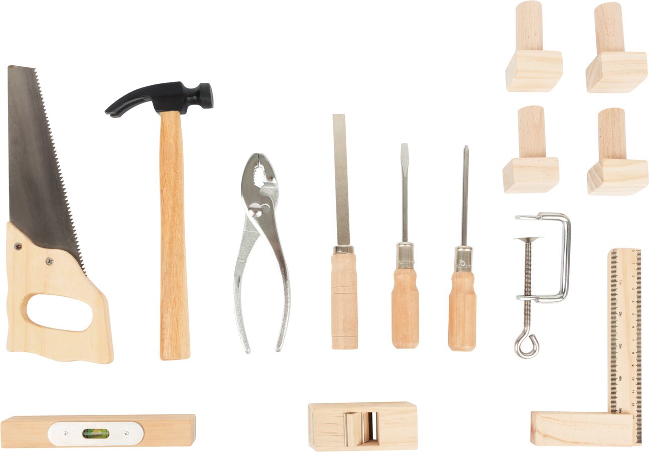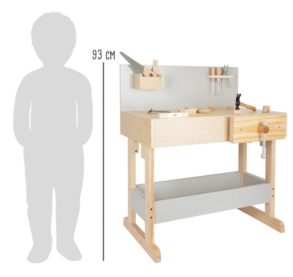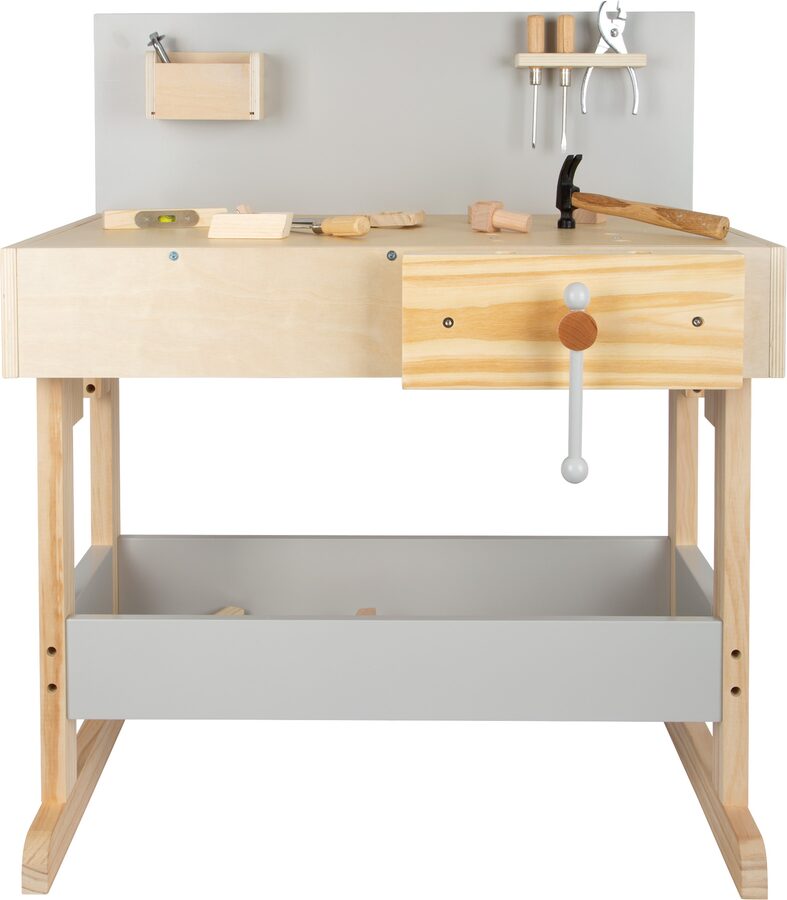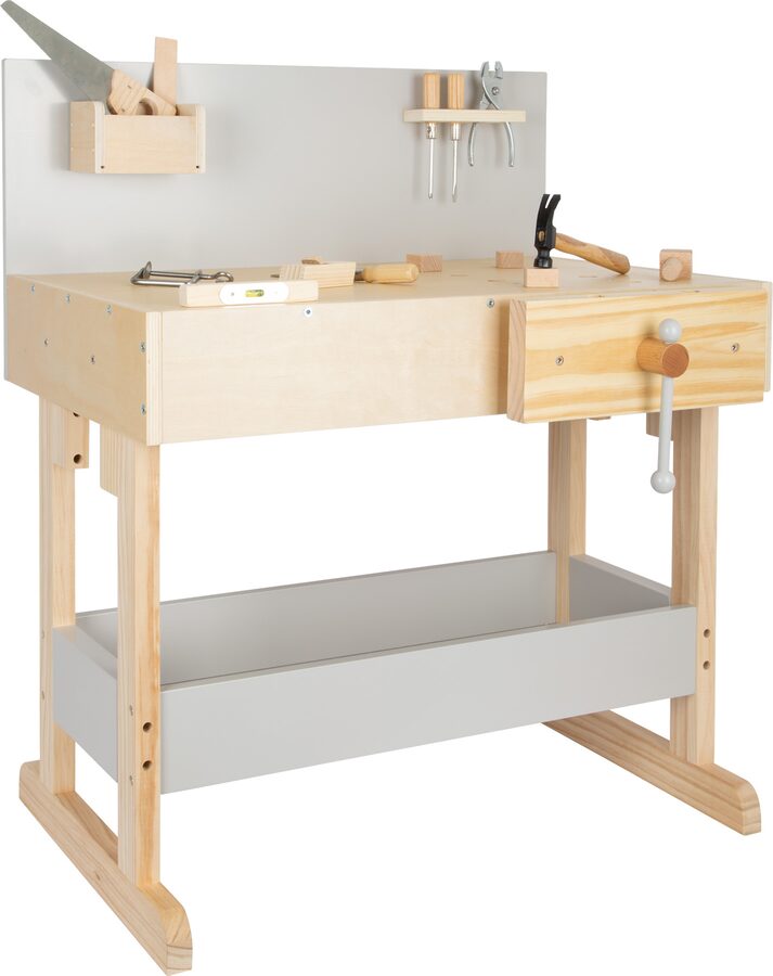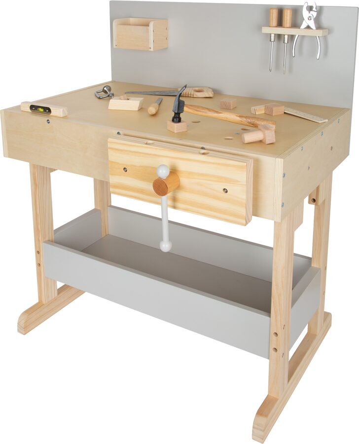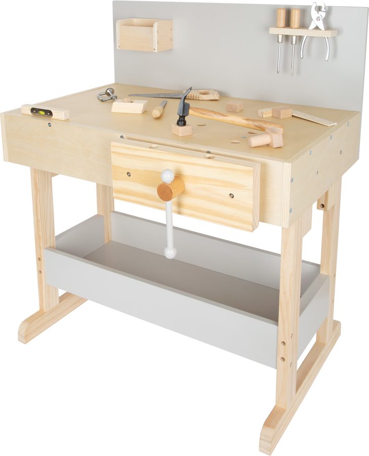 Robustní dětský pracovní stůl, který je dobře vybaven. Deset dětských nástrojů můžete uložit do několika míst, jsou zároveň vždy po ruce. Je vyroben z mixu přírodního a šedého dřeva, což je opravdu pěkná kombinace. Díky jednoduchému designu se hodí do každého interiéru. Pracovní stůl je vybaven pilou, kladivem, kleštěmi, svěrákem, tesařským úhloměrem, vodováhou, dlátem, hoblíkem, 2 šroubováky a 4 šrouby. Hlavní vlasnosti 14 ks nářádíMnoho úložného prostoruVyrobeno ze dřeva