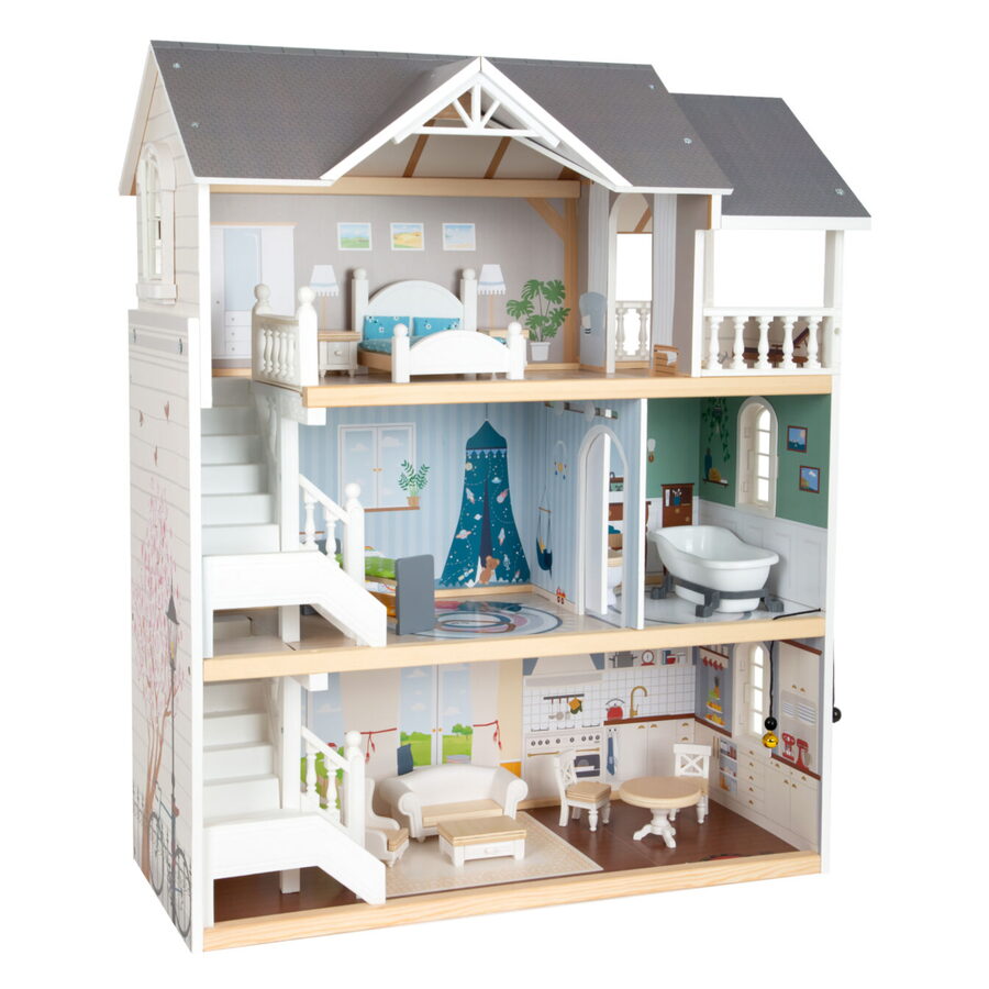 Poškozený obal. Nové zboží bez závad. Jídelna a obývací pokoj, dětský pokoj a koupelna, stejně jako ložnice a lodžie nabízejí dostatek prostoru pro hru. Schody, posuvné dveře, otevíratelná okna, noční stolky se zásuvkami a skutečný zvonek, který oznamuje příchod návštěvy, spolu s 12 kousky nábytku a mnoha doplňky činí z hraní dokonalou zábavu. Otevřená přední strana usnadňuje hraní a umožňuje také několika dětem hrát si s panenkami současně. Výrobek vyžaduje montáž, dodáváno s detailním návodem k sestavení. Velký, stabilní dřevěný domeček pro panenky s detailním designem uvnitř i vně domečku.Otevřená přední strana usnadňuje společnou hru více dětí.3 podlaží propojená schodištěm, 5 pokojů a terasa nabízejí prostor pro hru.Nábytek s dřevěnými detaily a plastovými díly pro realistickou zábavu.Funkční zvonek a další prvky jako posuvné dveře, otevíratelná okna, noční stolek se zásuvkami. Hlavní vlastnosti: Díky světlé vnější fasádě a modernímu designu se vila hodí do jakéhokoliv dětského či obývacího pokoje.Dostatečně velký pro společnou hru více dětí.Funkční zvonek a prvky nábytku.Obsahuje 12 ks nábytku s doplňky.Vhodné pro panenky do velikosti 12 cm (např. LE11804). Ocenění hračky: Top 10 Spielzeug Nominiert 2021