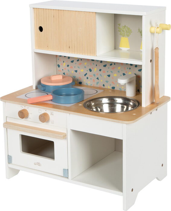 Tato moderní bílá kuchyňka v jemném skandinávském stylu s barevným vzorem inspirovaným terazzem je ideálním vstupem do světa kreativní hry na vaření. Kuchyňka je praktická a skladná a nabízí vše, co malí kuchaři potřebují – sporák s otočnými knoflíky, troubu s magnetickými dvířky, kovový dřez s kohoutkem a také pánev, hrnec s pokličkou a dřevěnou vařečku. Stylová kombinace bílé barvy, přírodního dřeva a hravého vzoru na zadní stěně dělá z kuchyňky krásný doplněk dětského pokoje. Pracovní plocha ve výšce přibližně 22 cm je ideální pro malé dětské ručičky, ale také jako „kuchyňka pro panenky“ – skvělá pro hraní s velkými panenkami (cca 43 cm).Kompaktní konstrukce šetří místo, takže se kuchyňka hodí i do menších bytů nebo jako druhá kuchyňka u prarodičů. Děti si při hře osvojují používání kuchyňského náčiní, rozvíjejí fantazii, jemnou motoriku i sociální dovednosti při společném vaření. Hlavní vlastnosti: kuchyňka, hrnec s pokličkou, pánev, dřevěná vařečkavyjímatelný kovový dřez, dvířka trouby s magnetickým zavíránímrozmanité úložné prostory a odkládací plochy otočné knoflíky s cvakavým zvukem pro realistický zážitek z kuchyně díky pracovní výšce 22 cm si s ní lze hrát i jako s "kuchyní pro panenky" s většími panenkami (cca 43 cm). podporuje hraní rolí a kreativitu a rozvíjí sociální dovednosti
