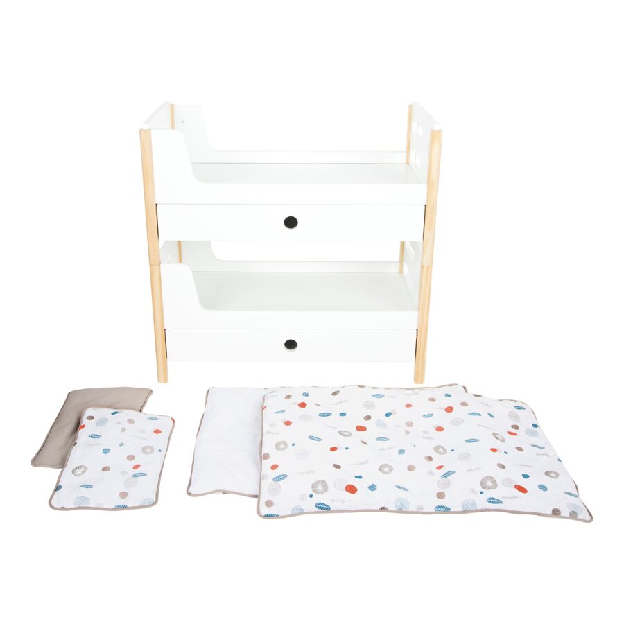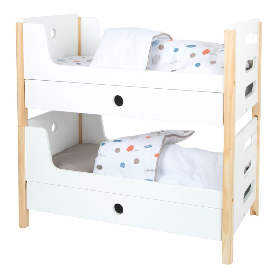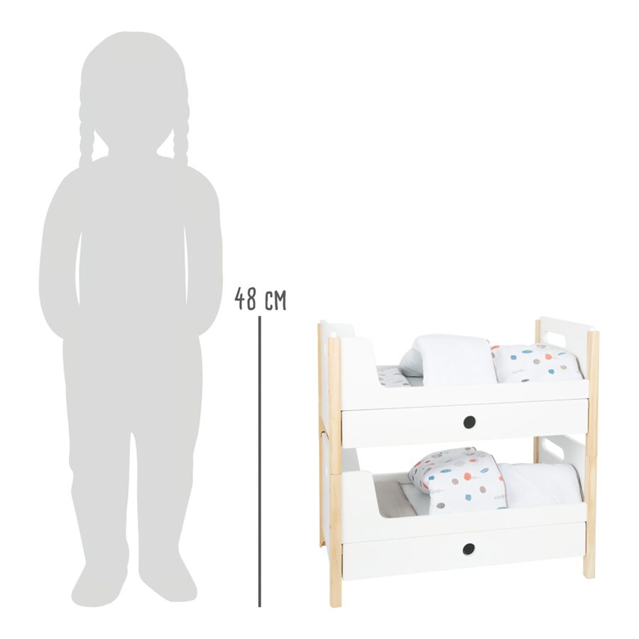 Poškozený obal. Nové zboží bez závad. Krásná poschoďovka! Nadchne vás funkcí i skandinávským designem, díky kterému se pěkně vejde do každého dětského pokoje. Je moderní, oboustranná, má genderově neutrální povlečení a oversized peřiny, ve kterých se krásně vyspí panenky a plyšáci do 46 cm. Poskládáním postelí na poschoďové se na jedné straně vytvoří žebřík. Šuplíky pod každou z postelí jsou perfektní k uložení doplňků panenek. Vysoce kvalitní, stabilní konstrukce, zaoblené hrany, viditelně ze dřeva... Perfektní hračka do každého dětského pokoje. Hlavní vlastnosti Můžete použít jako jednolůžka nebo poschoďovou postelŠuplíky pro uložení doplňků panenekGenderově neutrální povlečeníOversized peřinyZaoblené hrany, viditelně dřevěnáPro panenky a plyšáky do 46 cmSkandinávský lineární design Little ButtonŘada atraktivního příslušenství pro panenky Little Button nabízí pestrou paletu výrobků, od kočárku přes jídelní židličku až po skříň. Zákazníky snadno zaujmou jednotným funkčním a decentním designem využívajícím přímé linie a střídmé neutrální barvy. Díky tomu spolu mohou vytvořit ucelené harmonické soupravy, které vkusně doplní moderní interiér. Důmyslná konstrukce a kvalitní zpracování pomáhají zajistit vysokou stabilitu, bezpečnost a dlouhou životnost. Založte s jejich pomocí stylový koutek pro panenky, kde mohou Vaše děti rozvíjet svou fantazii a pečovatelské dovednosti.