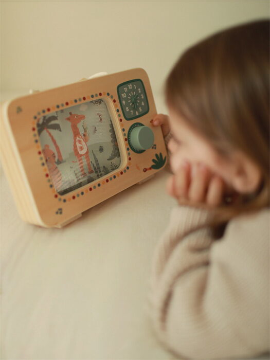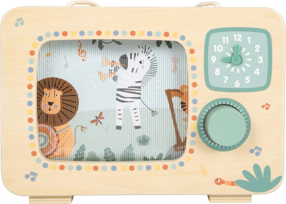 Tato kouzelná hudební skříňka ve tvaru televize vyrobená ze 100% certifikovaného dřeva FSC® přináší dětem radost z hudby, pohybu i objevování. Po otočení knoflíku se barevný obrázek safari zvířátek rozpohybuje a zazní jemná melodie, doprovázená příjemným cvakavým zvukem otočného knoflíku.V hlavní roli je veselý orchestr zvířátek ze safari, který ožívá při každém otočení. Díky praktické rukojeti si mohou děti hrací skříňku snadno vzít kamkoli s sebou. Na přední straně se nachází hodiny s potištěným ciferníkem a pohyblivými ručičkami, které lákají k prvním hrám s časem. Hračka rozvíjí jemnou motoriku, koordinace ruka-oko, sluchové i zrakové vnímání a podporuje představivost. Perfektně ladí s ostatními produkty z oblíbené kolekce Safari, společně tvoří harmonický svět plný hudby a dobrodružství. Hlavní vlastnosti: vyrobena ze 100% certifikovaného dřeva FSC® ve tvaru televize, originální a dekorativní doplněk dětského pokoje pohyblivý obrázek safari zvířátek otočný knoflík s jemným cvakavým zvukem praktická rukojeť umožňuje snadné přenášení kamkoli potištěné hodiny s pohyblivými ručičkami rozvíjí jemnou motoriku, koordinaci, zrakové a sluchové vnímání Značka a certifikát FSC® (Forest Stewardship Council) zaručuje, že dřevo, ze kterého byl produkt vyroben, nebylo vytěženo nelegálně a pochází z lesů obhospodařovaných šetrným či přírodě blízkým způsobem, ve kterém jsou dodržovány přísné environmentální a sociální požadavky. Značka FSC® na výrobku znamená, že svým nákupem pomáháte chránit lesy a podporujete šetrné, odpovědné či přírodě blízké hospodaření, díky kterému jsou naše lesy stabilnější, zdravější, mají přirozenou druhovou skladbu a lépe odolávají negativním následkům klimatických změn.