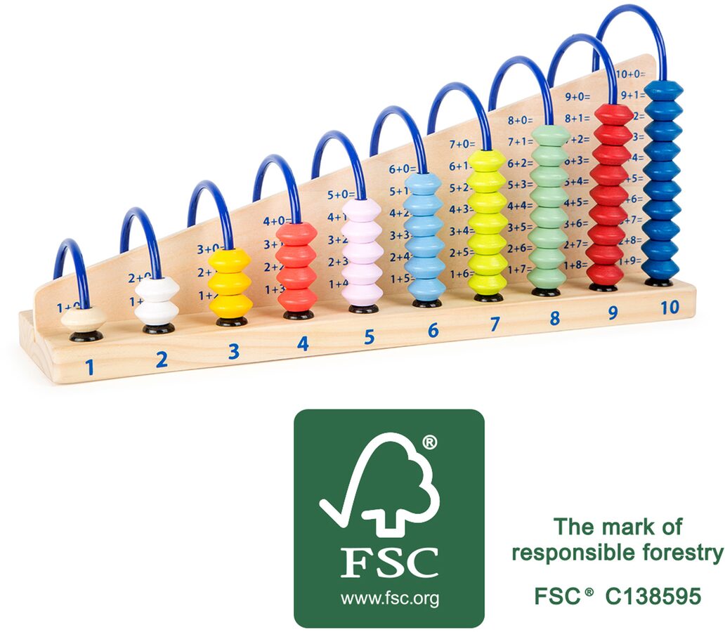 Dřevěné korálky na desíti kovových vesele malovaných obloucích, funguje jako vizuální pomůcka pro výpočty. Na vnitřní dřevěné stěně je 55 matematických příkladů z každé strany. Příklady odčítání a sčítání mohou děti lehce vypočíst pomocí dřevěných korálků! Kvalitní dřevěné počítadlo. Hlavní vlastnosti: barevné korálky100% FSC® dřevovýška 14 cm Značka a certifikát FSC® (Forest Stewardship Council) zaručuje, že dřevo, ze kterého byl produkt vyroben, nebylo vytěženo nelegálně a pochází z lesů obhospodařovaných šetrným či přírodě blízkým způsobem, ve kterém jsou dodržovány přísné environmentální a sociální požadavky. Značka FSC® na výrobku znamená, že svým nákupem pomáháte chránit lesy a podporujete šetrné, odpovědné či přírodě blízké hospodaření, díky kterému jsou naše lesy stabilnější, zdravější, mají přirozenou druhovou skladbu a lépe odolávají negativním následkům klimatických změn.
