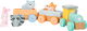 Hú, hú, přijíždí vlak! Tento vláček v pastelových barvách veze veselé pasažéry. Dva vagóny můžete jednoduše spojit. Malá lokomotiva se skládá z podvozku a dvou nasazovacích kostek. V balení také barevná liška, zajíc, mýval a medvěd, kteří už čekají na odjezd vlaku. Hlavní vlastnosti: 1 lokomotiva, 2 vagónyfigurky zvířátekdřevěná hračka v pastelových barvách
