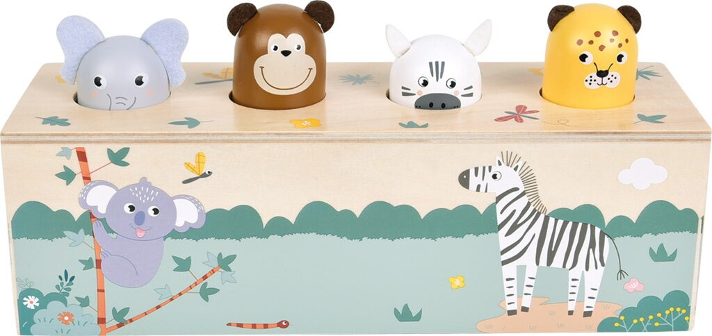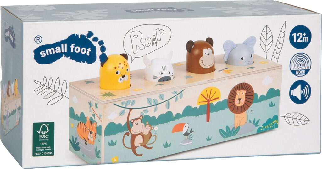 Tato interaktivní dřevěná hračka z FSC® 100% certifikovaného dřeva rozhýbe čtyři oblíbená zvířátka ze safari a navíc vydává reálné zvířecí zvuky! Stačí stisknout jedno zvířátko a ozve se jeho typický zvuk. Děti se tak hravou formou učí poznávat hlasy zvířat a zároveň objevují princip příčiny a následku. Čtyři detailně zpracované hlavičky – slon, opice, zebra a leopard překvapí děti veselým pohybem a autentickým zvukem při jemném stisku. Díky robustnímu dřevěnému zpracování, dětem přívětivým ilustracím a moderním safari designu je hračka nejen krásná, ale i odolná a trvanlivá. Hravý způsob, jak děti učit novým dovednostem, podporovat jejich zvídavost a přitom se skvěle bavit! Hlavní vlastnosti: z FSC® certifikovaného dřevanapájení na bateriezvuková hračkarozvíjí jemnou motoriku, sluchové vnímání, pozornost a logické myšlenípomáhá k porozumění souvislostem mezi akcí a reakcíbaterie 2xAAA 1,5 V - nejsou součástí balení Značka a certifikát FSC® (Forest Stewardship Council) zaručuje, že dřevo, ze kterého byl produkt vyroben, nebylo vytěženo nelegálně a pochází z lesů obhospodařovaných šetrným či přírodě blízkým způsobem, ve kterém jsou dodržovány přísné environmentální a sociální požadavky. Značka FSC® na výrobku znamená, že svým nákupem pomáháte chránit lesy a podporujete šetrné, odpovědné či přírodě blízké hospodaření, díky kterému jsou naše lesy stabilnější, zdravější, mají přirozenou druhovou skladbu a lépe odolávají negativním následkům klimatických změn.
