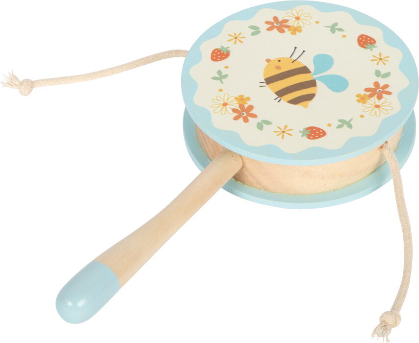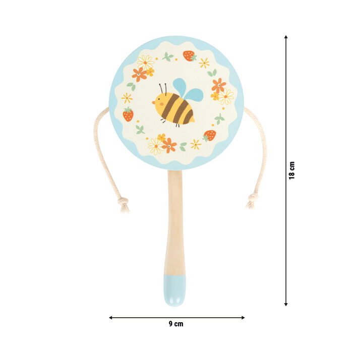 Rytmus na dosah ruky! Tento roztomilý bubínek se snadno vejde do malé dětské ručky a přináší spoustu rytmické zábavy! Při hraní navíc podporuje koordinaci oko–ruka a první seznámení se světem zvuků. Rotační bubínek je krásně barevný s veselým motivem včelky a květiny. Je ideální pro malé hudebníky, kteří rádi zkoumají, jak věci zní. Jak to funguje? Stačí uchopit bubínek za dřevěnou rukojeť a roztočit ho mezi dlaněmi. Dvě dřevěné kuličky na provázku začnou při pohybu narážet do bubínku a vytvářejí zábavný rytmický zvuk. Děti si tak přirozeně procvičují motoriku i cit pro rytmus. Hlavní vlastnosti: rozvíjí jemnou a hrubou motorikuzlepšuje koordinaci pohybůpodporuje hudební vnímání