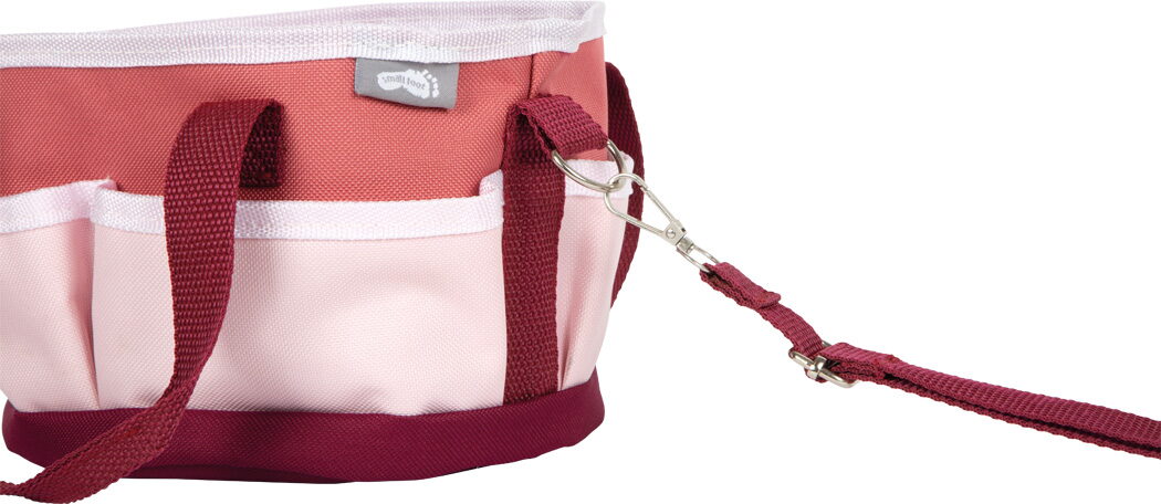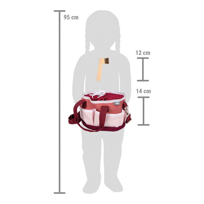 Taška s příslušenstvím na čištění a péči o koně. Je vhodná pro všechny děti, které mají rády koníky. Taška je odolná, praktická a dostatečně prostorná, aby pojala veškeré vybavení. Péče o koně je součástí každodenní rutiny každého fanouška koní a koníci kartáčování milují. Taška s doplňky je vyrobená z vysoce kvalitních materiálů a máte vše, co potřebujete, hned po ruce, i když jste na cestách. Mezi doplňky patří kartáč, hřeben, škrabka na kopyta a hřeben na hřívu, to vše se vejde do prostorného vnitřku tašky a do malé boční kapsy. A samozřejmě nechybí dřevěné jablko a mrkev. Sada se dodává s turnajovou stuhou, kterou si děti mohou připevnit na obojek hlavy svého koníka nebo na vlastní oblečení. Pomůcky na čištění koní jsou dokonale přizpůsobeny potřebám mladých fanoušků koní, takže mladí jezdci mohou při hře popustit uzdu své fantazii. Pohodlná stahovací šňůrka umožňuje tašku doširoka otevřít, ale také úplně zavřít. Tuto tašku pro děti lze nosit za obě uši nebo nastavitelný ramenní popruh. S touto sadou péče se mohou děti starat o svého oblíbeného koně stejně jako profesionálové. Hlavní vlastnosti: nezbytné příslušenství v tašce pro každého fanouška konínastavitelný ramenní popruhkomplexní sada