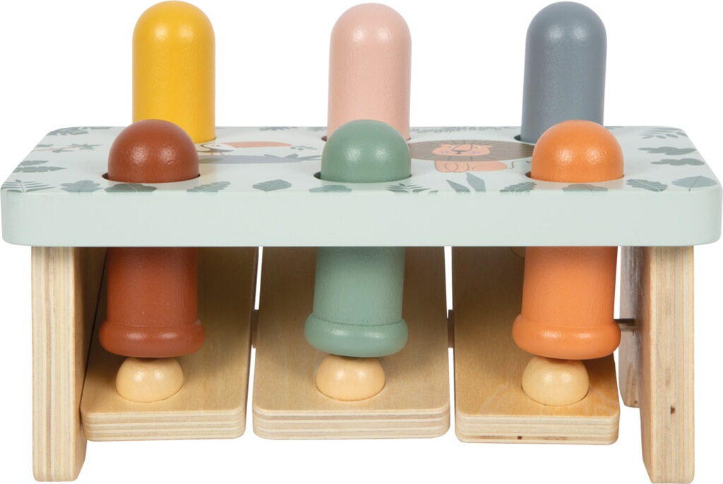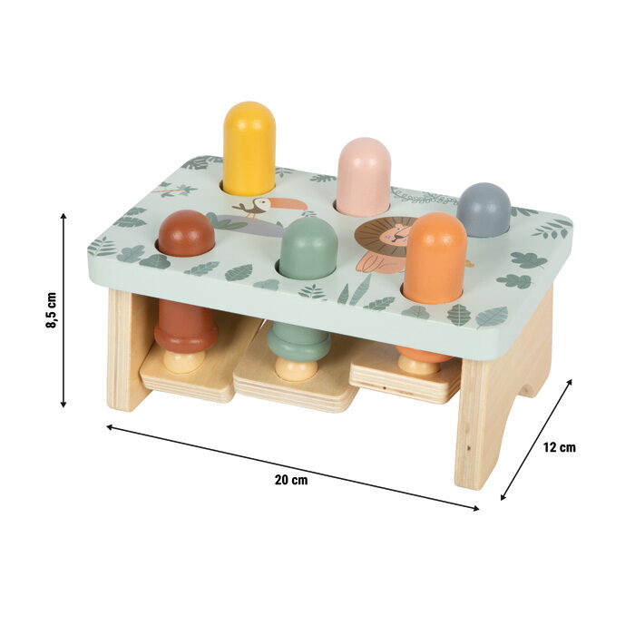 Tato nádherně zpracovaná zatloukací hra v safari stylu je vyrobena ze 100% FSC® certifikovaného dřeva a zve děti ke hraní plnému překvapení! Pomocí kladívka děti zatloukají dřevěné kolíčky do lavičky, a právě tehdy přichází ten správný efekt, když zatlučou jeden kolík, na opačné straně vyskočí druhý! Roztomilé zvířecí motivy a moderní barevné provedení podněcují dětskou fantazii a chuť objevovat. Pohyblivé kolíčky zároveň dětem ukazují princip příčiny a následku, ideální pro hravé učení. Tato hračka je dlouhotrvajícím společníkem, který spojuje radost ze hry s rozvojem důležitých dovedností a navíc skvěle vypadá! Hlavní vlastnosti: vyrobeno ze 100% FSC® certifikovaného dřevapodporuje rychlé reakce, motoriku a koordinaci ruka-okopevné a odolné zpracováníkladívko padne skvěle do dětských ručičekkrásný designstimuluje dětskou fantazii Značka a certifikát FSC® (Forest Stewardship Council) zaručuje, že dřevo, ze kterého byl produkt vyroben, nebylo vytěženo nelegálně a pochází z lesů obhospodařovaných šetrným či přírodě blízkým způsobem, ve kterém jsou dodržovány přísné environmentální a sociální požadavky. Značka FSC® na výrobku znamená, že svým nákupem pomáháte chránit lesy a podporujete šetrné, odpovědné či přírodě blízké hospodaření, díky kterému jsou naše lesy stabilnější, zdravější, mají přirozenou druhovou skladbu a lépe odolávají negativním následkům klimatických změn.