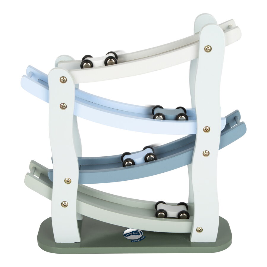 Poškozený obal. Nové zboží bez závad. Na značky, připravit, start! Tato dřevěná kaskádová závodní dráha nabízí prostor pro změření rychlosti 4 autíček. Z jednoho patra na druhé, autíčka dělají přemety a jen koukat na ně je zábavné. Dráha je vyrobena z přírodního a bílého dřeva, jedno autíčko je přírodní, zbylé 3 jsou barevné. Hračka rozvíjí motoriku dětí, také koordinaci ruka-oko. Hlavní vlastnosti Klasický design v modrošedé barvěOboustranná autíčka s pogumovanými kolyRozvíjí motoriku a koordinaci ruka-oko