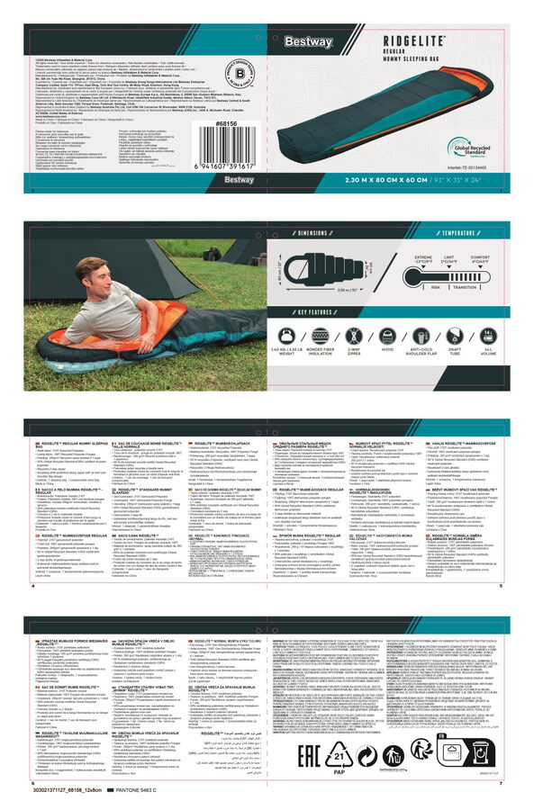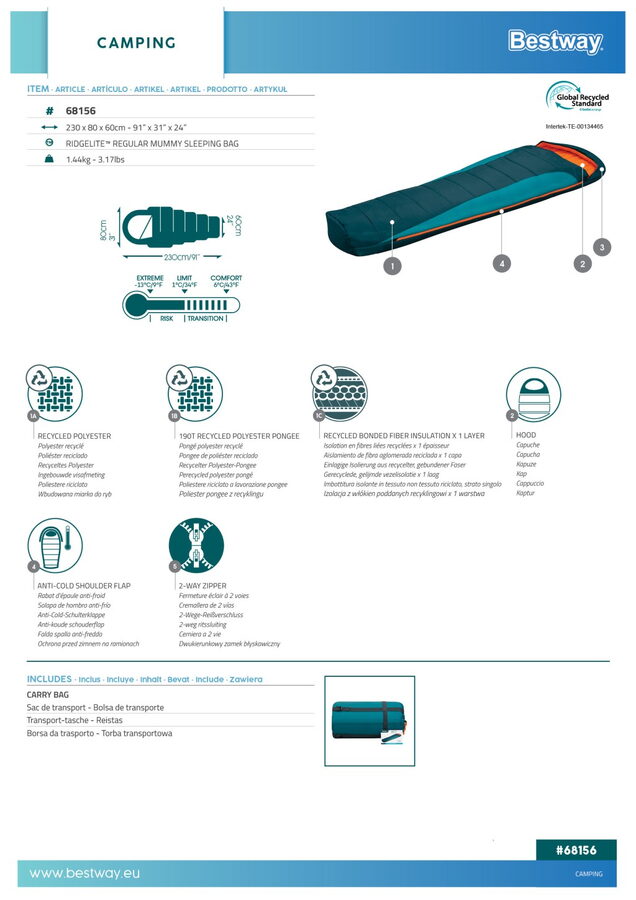 Velikost spacího pytle je 2,30mx 80×60 cm. Část u nohou má 60 cm u hlavy 80cm. Ideální rozsah teploty: 1 °C/ 6 °C, comfort je 6 °C, extreme –13°C. Hmotnost výrobku: 1,40 kg Mumiový spací pytel s nastavitelnou kapucí Vnější tkanina: Recyklovaný polyester 210T. Tkanina podšívky: Ponžé z recyklovaného polyesteru 190T Výplň: Recyklovaný vstřikovaný materiál 280 g/m2 x 1 vrstva 90 % recyklovaný polyester s certifikací GRS (Global Recycled Standard). Recyklovaný dvoucestný zip. Izolační ochrana proti profukování podél zipu s ramenní chlopní proti chladu. Obsah: 1 spací pytel, 1 vak na spacák