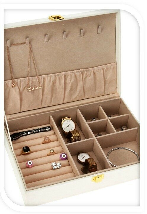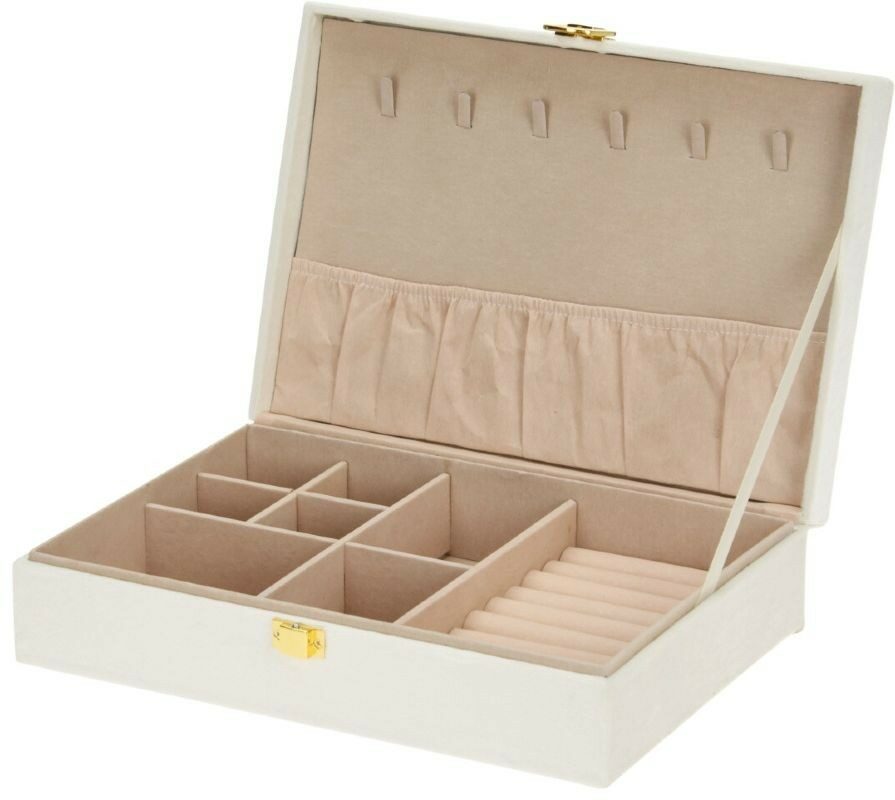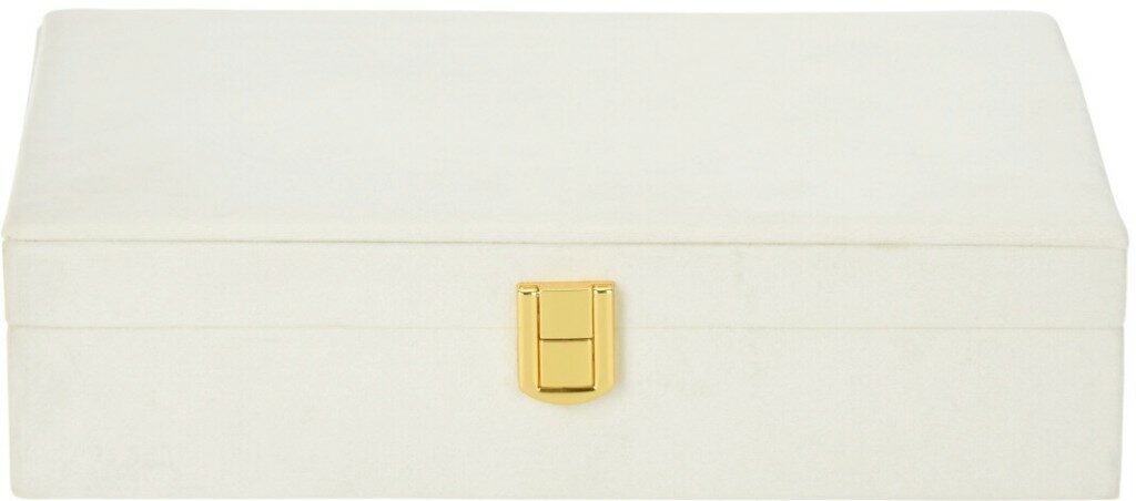 - bílá šperkovnice se semišovým povrchem- perfektní pro organizované a přehledné umístění šperků i hodinek- chrání šperky před prachem a poškozením- uvnitř několik přihrádek na drobné šperky, náramky, hodinky- ve víku prostor pro zavěšení řetízků a náhrdelníků- snadné a rychlé zavírání na magnetický patent ve zlaté barvě- rozměry: 28 x 19 x 7 cm- barva: bílá / béžová- značka: Homestyling