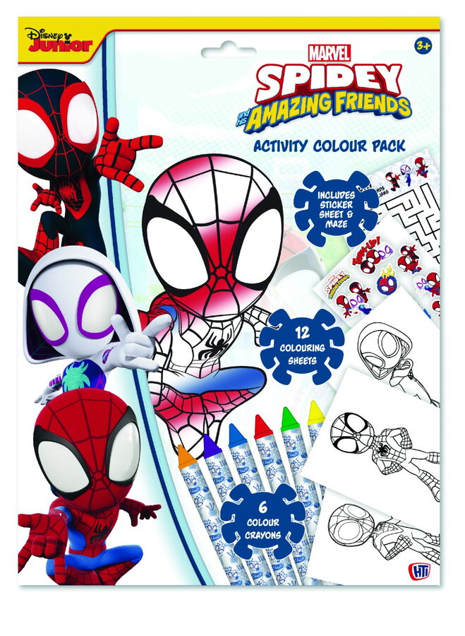 Dvanáct pracovních listu Spidey. Součástí je 6 voskovek a samolepky s oblíbenými hrdiny.