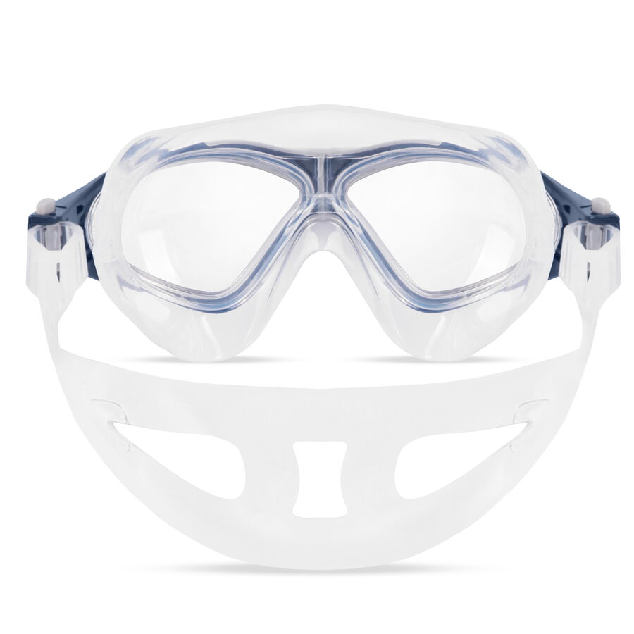 - Dokonalá těsnost: Měkká silikonová lícnice se citlivě přizpůsobí konturám obličeje a spolehlivě brání vniknutí vody k očím.