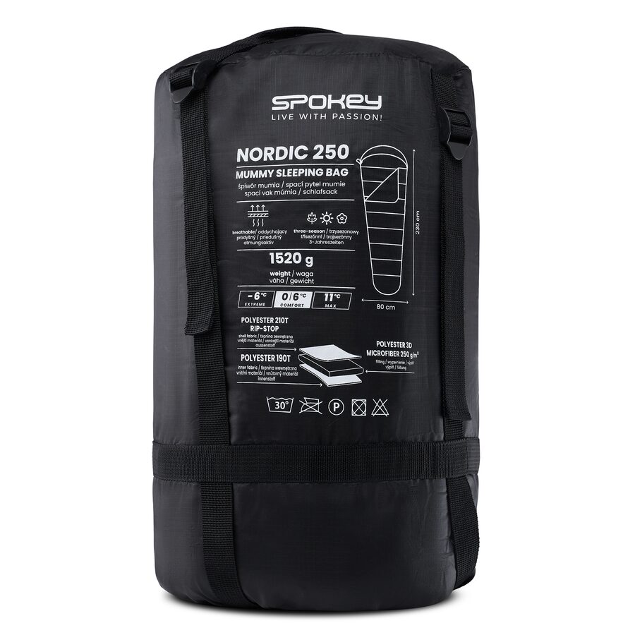 NORDIC 250 je třisezónní spací pytel mumie, který svým tvarem, kvalitou zpracování a kapucí zajišťuje nejen nejvyšší tepelný komfort, ale i dostatečný prostor pro nohy. Poskytuje vynikající ochranu a izolaci proti chladu – komfortní spánek zajistí v teplotním rozmezí 0/+6 °C, ale lze jej použít i v extrémních podmínkách -6/+11 °C.