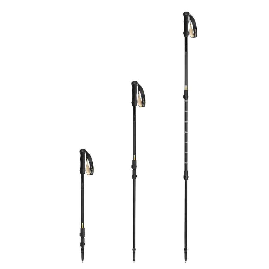 S holemi TRAIL se každý váš krok na horské stezce nebo v lesním terénu stane jistější. Jejich třídílná konstrukce z lehkého hliníku umožňuje přesné přizpůsobení délky vaší výšce. Po složení měří hole pouhých 62 cm, díky čemuž se snadno vejdou do batohu nebo zavazadla.
