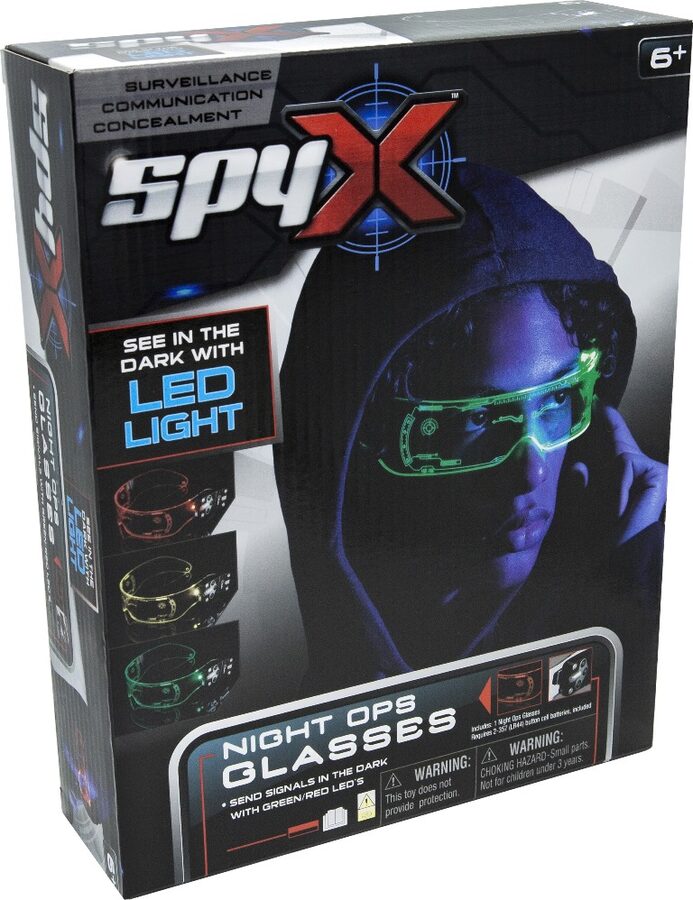 S high-tech brýlemi pro noční vidění SpyX LED je možné vidět ve tmě a vysílat jasné signály ostatním agentům pracujícím v nočních operacích a sledovacích úkolech. Špičkové brýle SpyX mají zelené, žluté a červené LED osvětlení, takže můžete svým společníkům posílat naléhavé zprávy pomocí LED signálů. Červená: STOP. Žlutá: POZOR. Zelená: TRASA JE ZDARMA! LED světla mohou také blikat. Blikající červené světlo: zrušte misi. Blikající zelené světlo: Nepřítel v dohledu. Jemné noční špionážní brýle mají také velmi jasné bílé LED světlo, se kterým lze špehovat ve tmě na vzdálenost až 4,6 metru. Pro starší 6 let. Odesílejte naléhavé zprávy a signály pomocí LED kontrolky: Blikající červené světlo: pozastavení úlohy. Blikající zelené světlo: Nepřítel v dohledu. Stálé červené světlo: STOP, kryjte se. Svítí zelené světlo: TRASA JE VOLNÁ! Plnou parou vpřed! Stálé žluté světlo: postupujte opatrně. VLASTNOSTI Opravdu skvělé špičkové špionážní brýle. Super jasné bílé LED cílové světlo pro špionáž ve tmě Žlutá, zelená a červená LED světla pro odesílání signálů jiným agentům. Nárazuvzdorné, high-tech, čiré brýle Stylový text "Mission graphics" vyrytý na povrchu brýlí. Součástí jsou 2x LR44 baterie. Pro děti od 6 let.