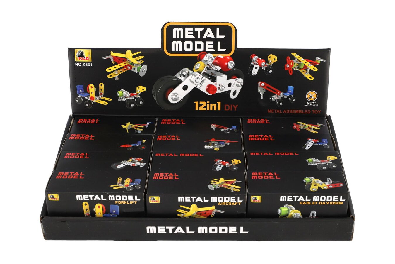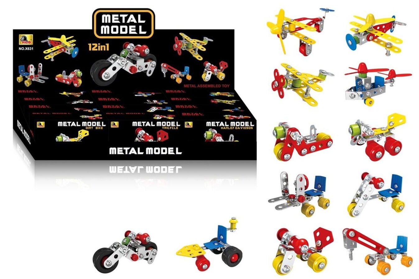 Stavebnice dopravní prostředek kov/plast v krabičce 11x6cm mix druhů 12ks v boxu