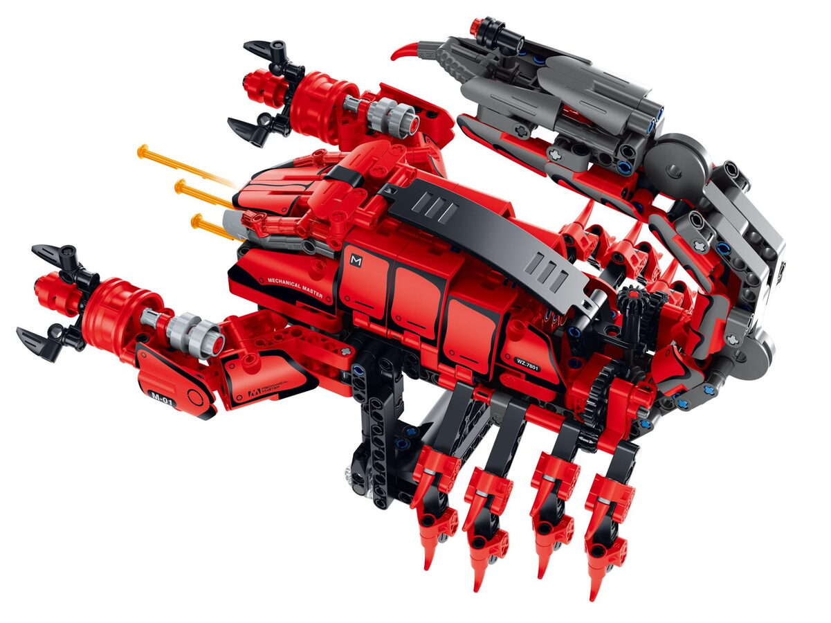 Sestavte si impozantního červeného škorpiona, který se během chvilky promění v mechanickou zbraň na ruku. Uchycení na ruku: pomocí nastavitelného mechanismu. Ovládací mechanismus na spodní straně umožňuje pohyb drápy, klepety a ocasem. Design ve stylu kybernetického brnění – vhodný i jako nositelný model. Vystřelovací prvky a realistické klouby. STEM vzděeelávání: rozvíjí technickou představivost, logiku a konstrukční dovednosti.