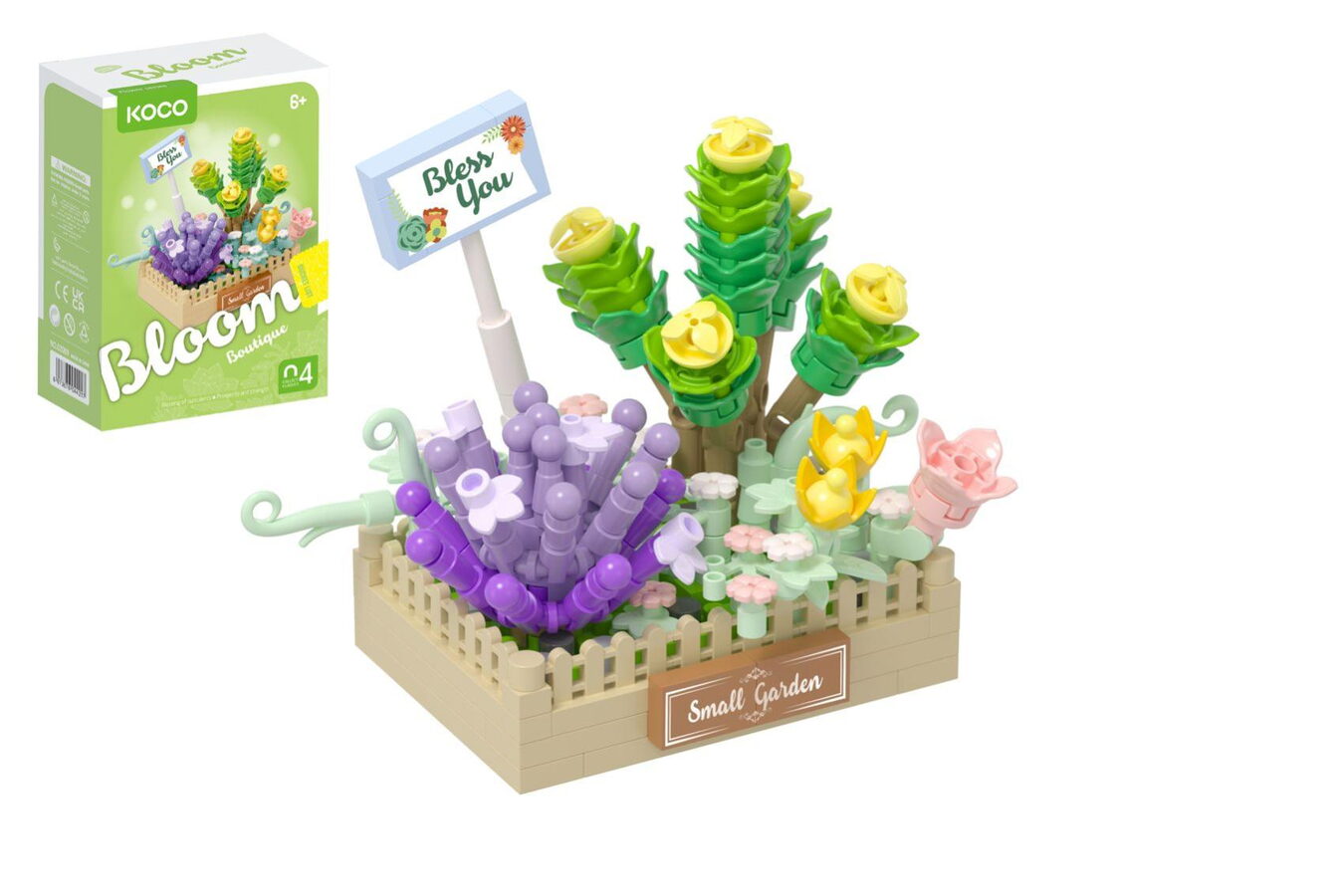 Přineste do svého života dotek přírody a radost z tvoření se stavebnicí KOCO. Tato sada vás okouzlí svými jemnými pastelovými tóny a rozkvetlou zahrádkou, která je zasazena do rustikálního dřevěného květináče s nápisem Small Garden. Díky pozitivnímu vzkazu „Bless You“ se hodí i jako dárek plný přání a pohody.