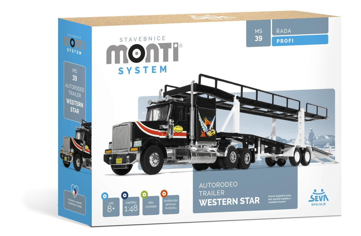 Model Monti System MS č.39 - Autorodeo Trailer je tahač Western Star s návěsem pro osobních aut. Western Star Monti System MS 39 v měřítku 1:48 patří do řady modelů Monti System PROFI, tedy mezi nejsložitější stavebnice s velkým počtem dílů.
