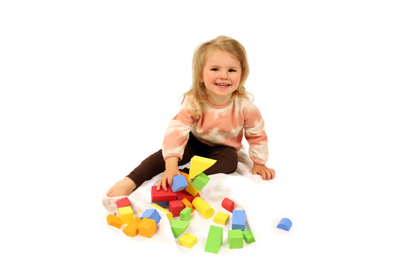 Kostky jsou vyrobeny z měkkého, gumového a netoxického materiálu. Pomocí kostek se u dětí rozvíjí jemná motorika rukou a díky barevnému provedení kostek i zrak. Kostky jsou baleny v plastové tašce. Sada obsahuje 29 ks.