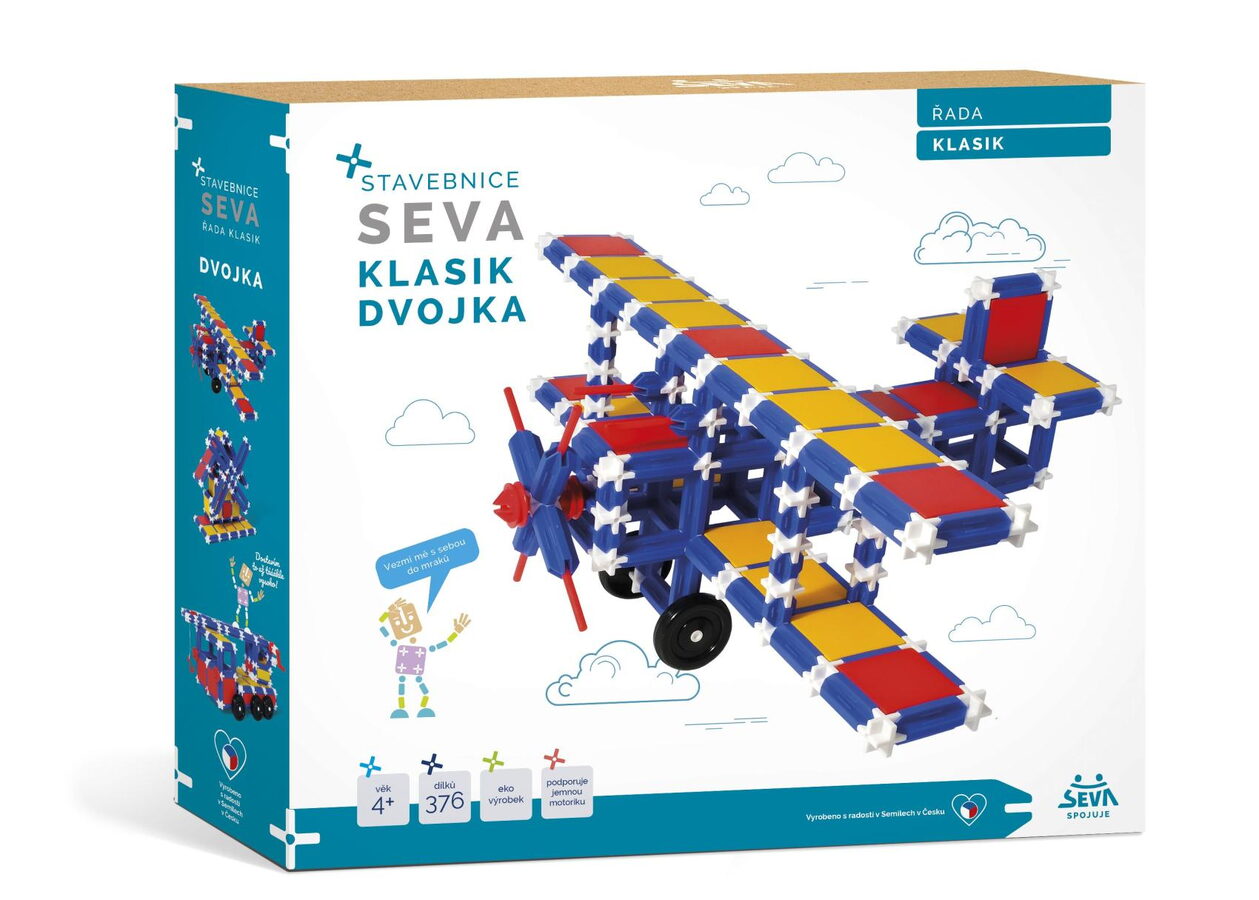 Stavebnice SEVA KLASIK - Dvojka obsahuje 366 dílů. Kromě základních dílů, které najdete také ve stavebnici SEVA KLASIK - Jednička, tu jsou křížové spojky Y, hák, klika, cívka a další, díky nimž postavíte například jeřáb. SEVA KLASIK - dvojka je určena pro děti od 4 let. Stavebnice vyhovuje evropské normě EN71 o bezpečnosti hraček a její kvalita je pravidelně kontrolována. Všechny stavebnice SEVA jsou navzájem kompatibilní a jejich možnosti se dají stále rozšiřovat.