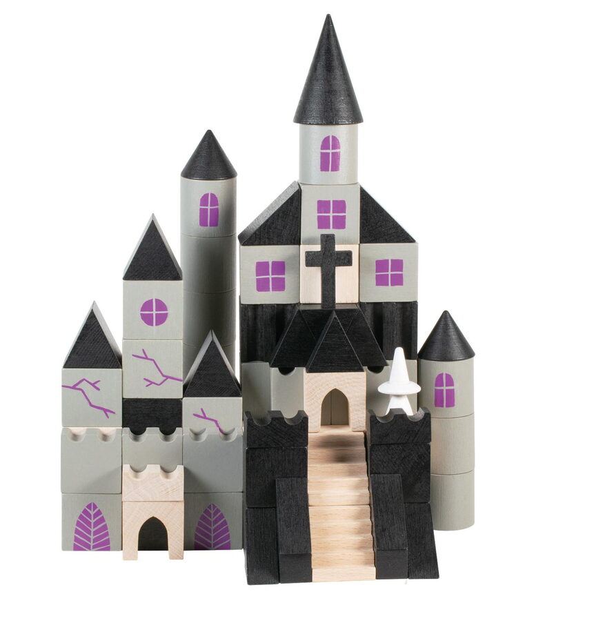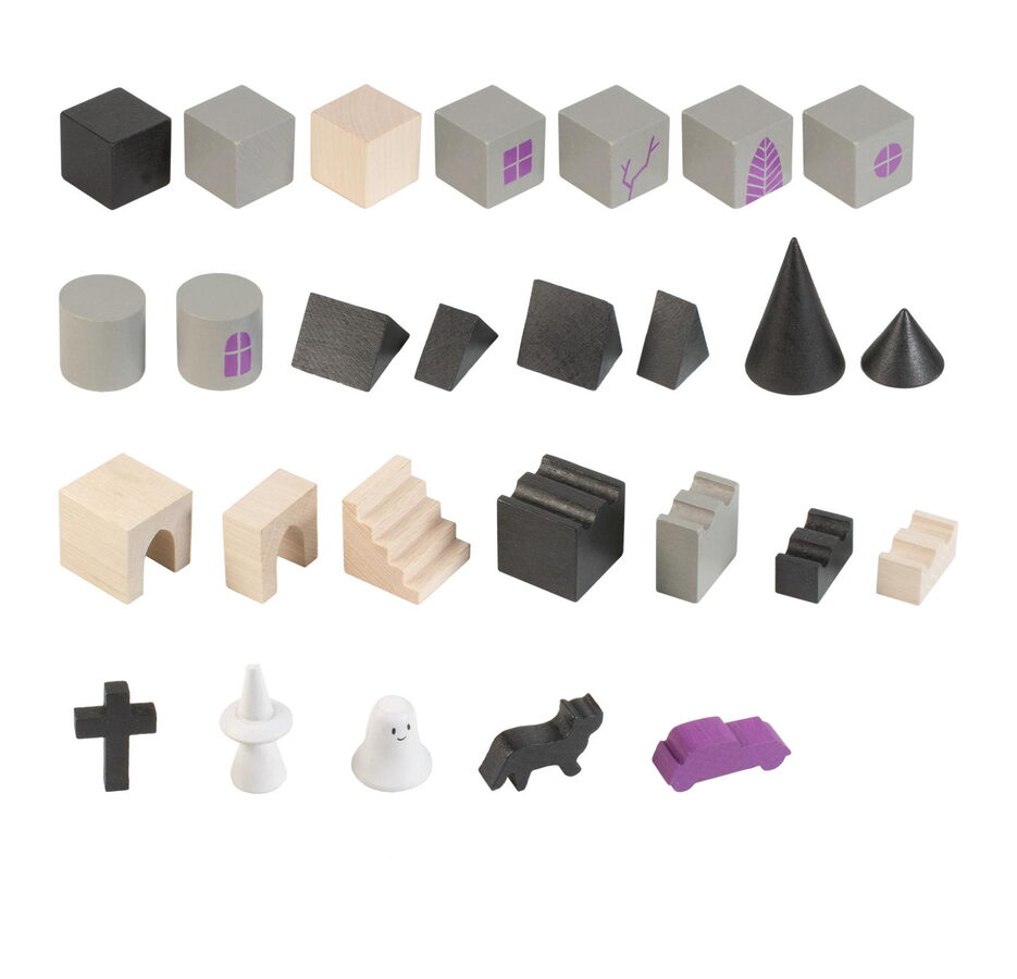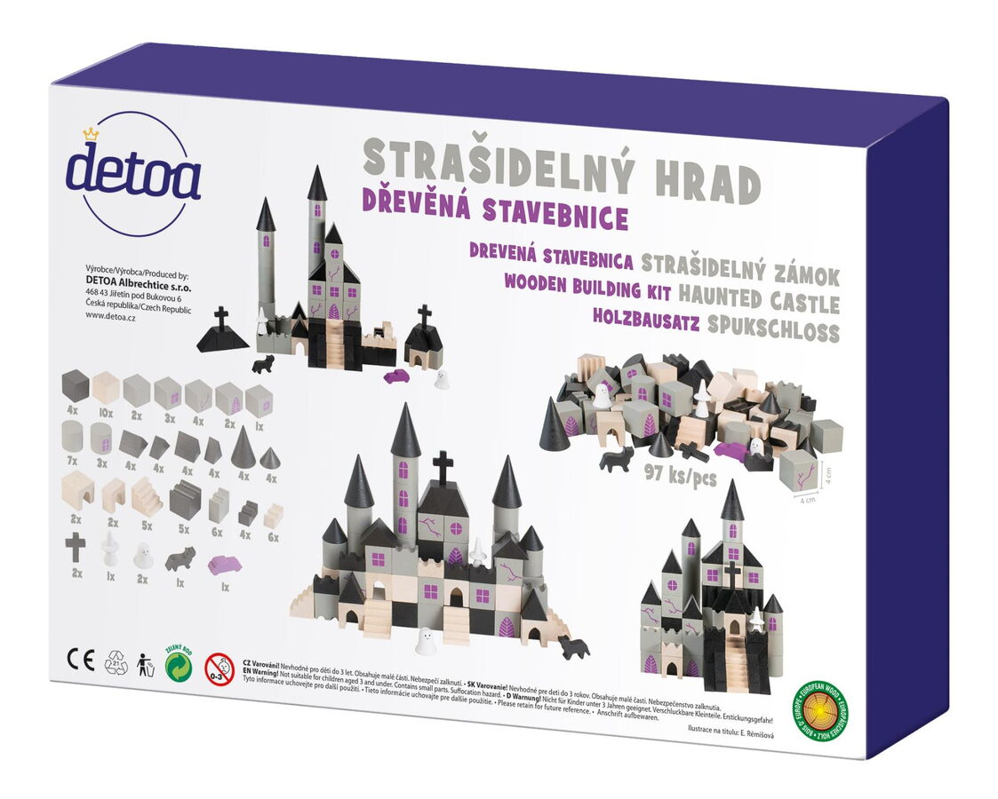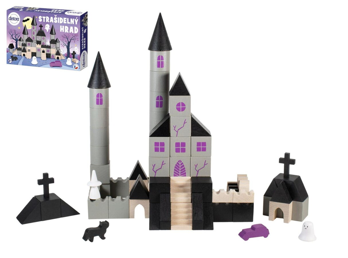 Dřevěná stavebnice obsahujíc 97 dílků s potiskem v různých tvarech a velikostech inspirovaná tajemným příběhem strašidelných hradů a duchů. Stavebnice pomáhá rozvíjet dětskou představivost, kreativitu a jemnou motoriku rukou. Baleno v papírové krabičce o rozměrech 295 x 200 x 60 mm.