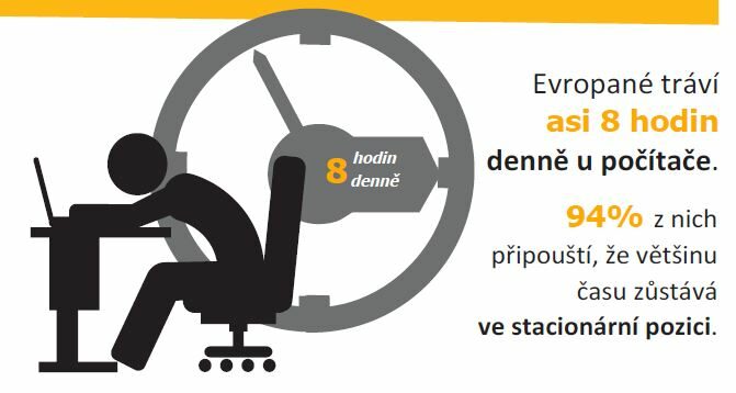Přes 50% pracujících v produktivním věku tráví až 8 hodin před obrazovkou počítače. Většina už zjistila, že takový způsob práce je spojen s vážnými fyzickými potížemi. Mezi nejčastější problémy patři bolesti zad, ramen, celková únava, tuhnutí krku, křeče prstů a bolesti v zápěstí při ohýbání, nebo pálení očí. Takové mohou být také následky špatně navrženého pracoviště. Samostatný katalog ergo produktů – detailní info o příčinách, následcích a řešení ergonomické kanceláře naleznete v příloze.